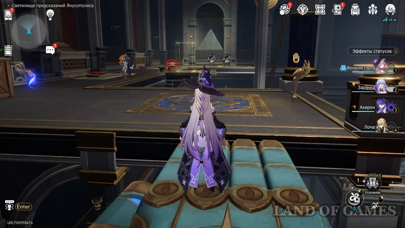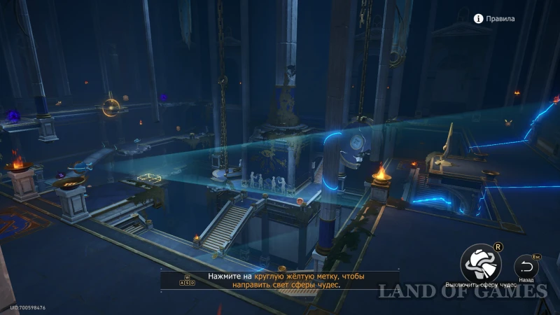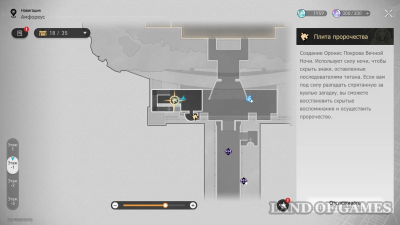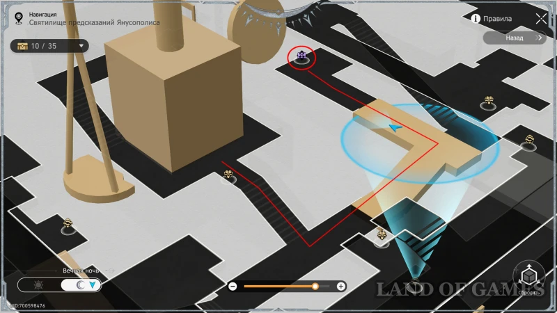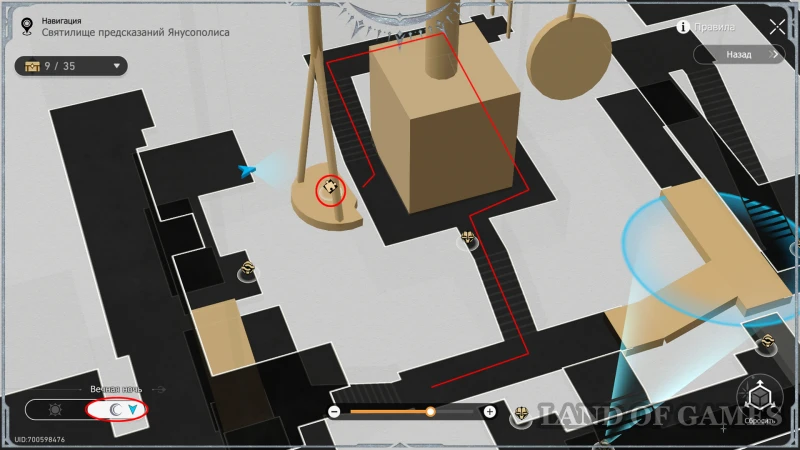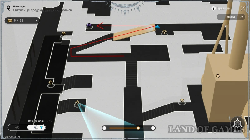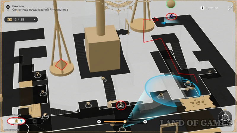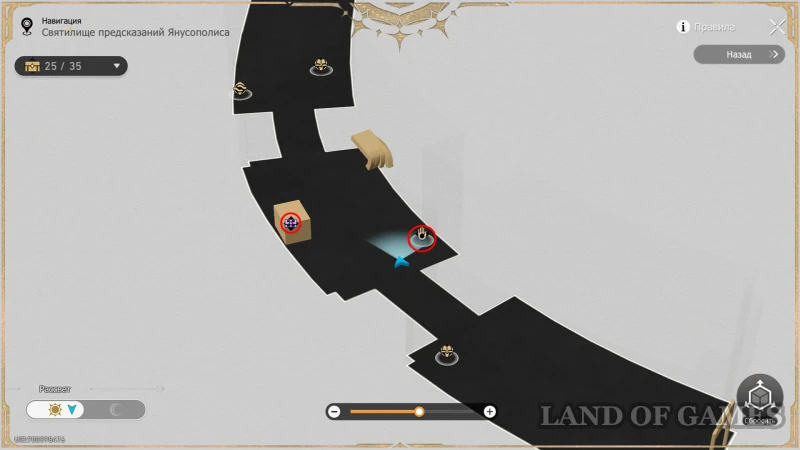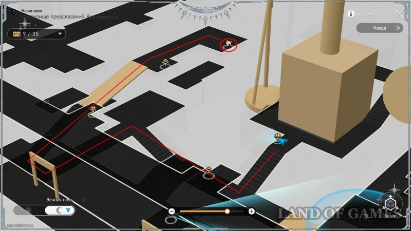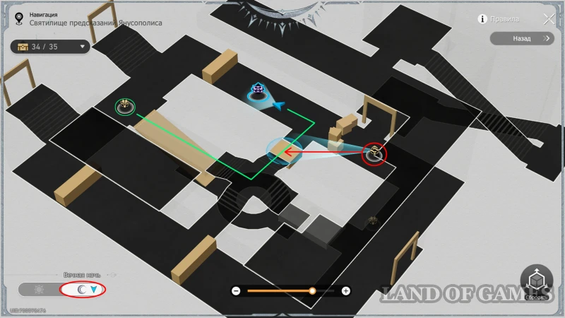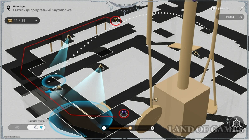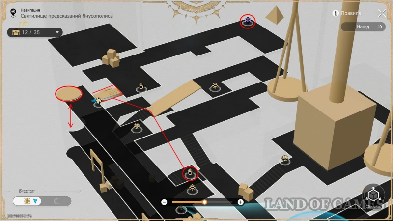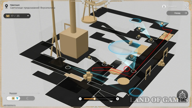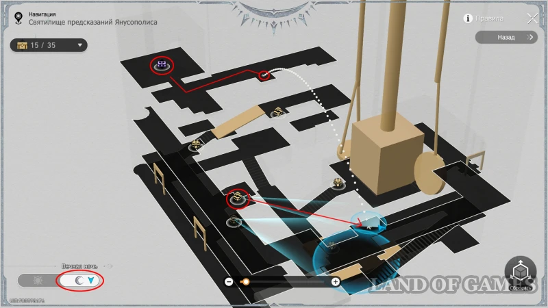 Войдя в зал с черного входа, сразу меняйте карту на Ночь (книга в центре) и поднимайтесь на средний уровень по левому крылу (там, где есть интерактивный мостик). Пройдя мимо монстров, активируйте плиту пророчества на краю этажа и соберите правильный пазл (как показано на скриншоте выше).