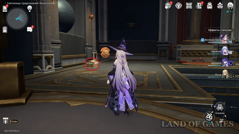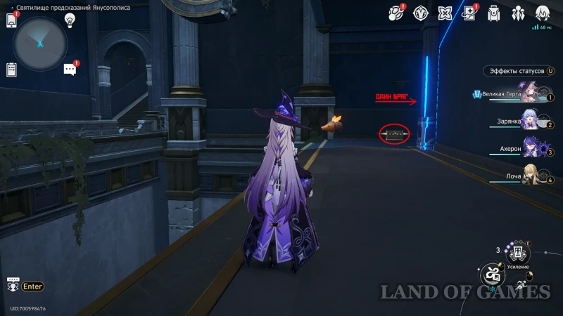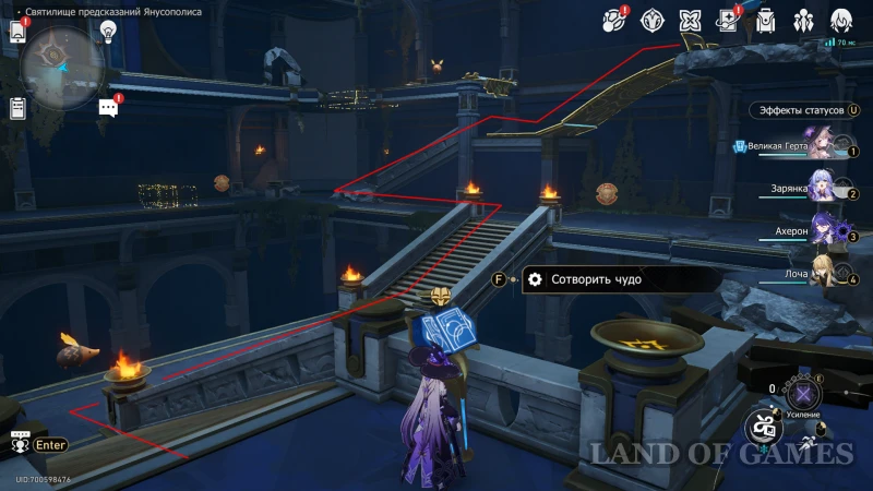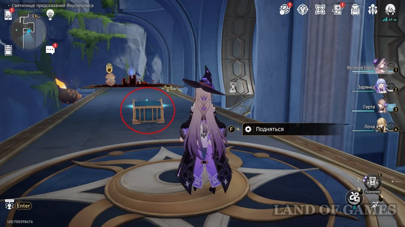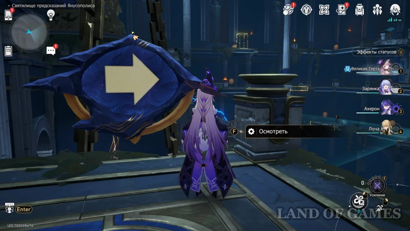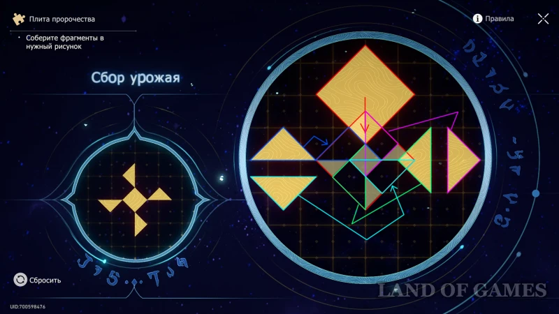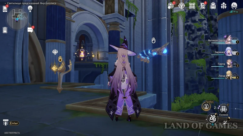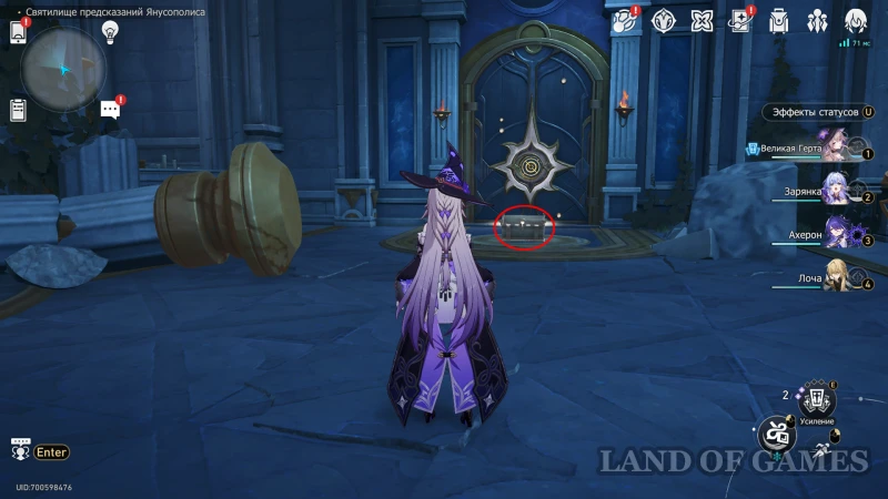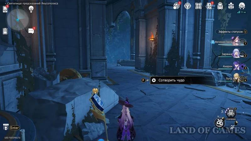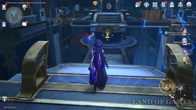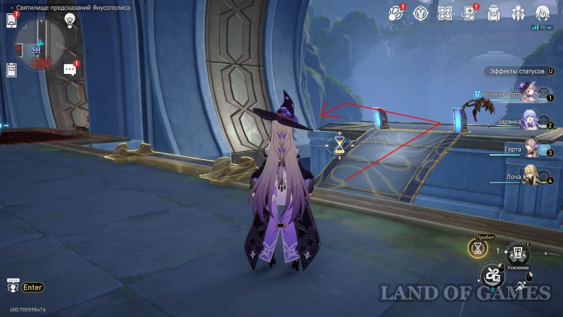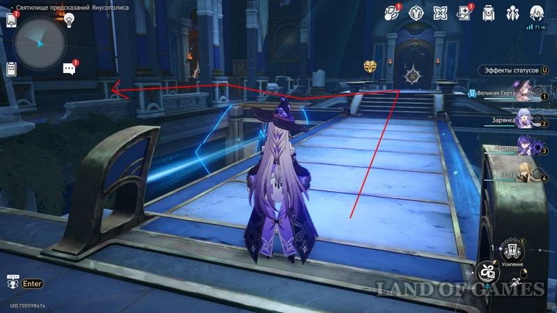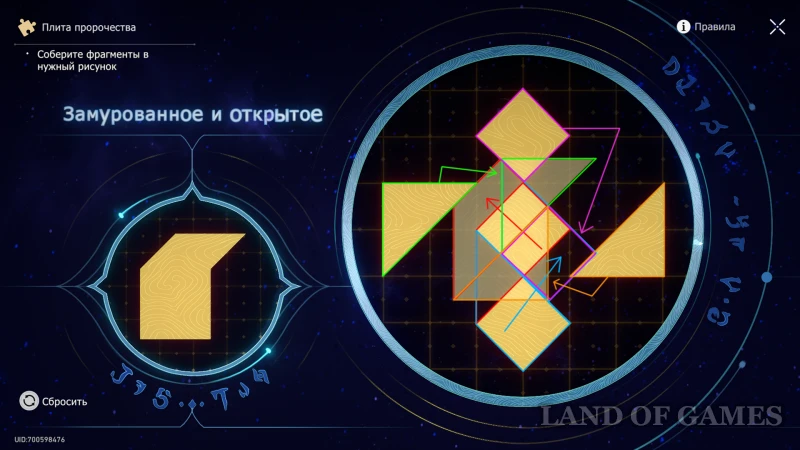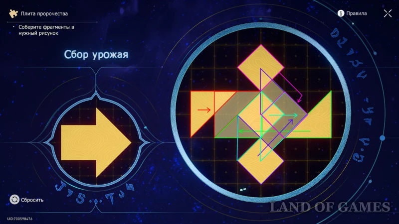 Войдя в зал с черного входа, сразу меняйте карту на Ночь (книга в центре) и поднимайтесь на средний уровень по левому крылу (там, где есть интерактивный мостик). Пройдя мимо монстров, активируйте плиту пророчества на краю этажа и соберите правильный пазл (как показано на скриншоте выше).