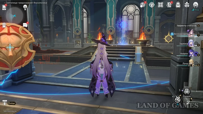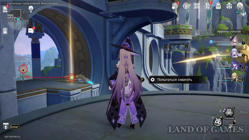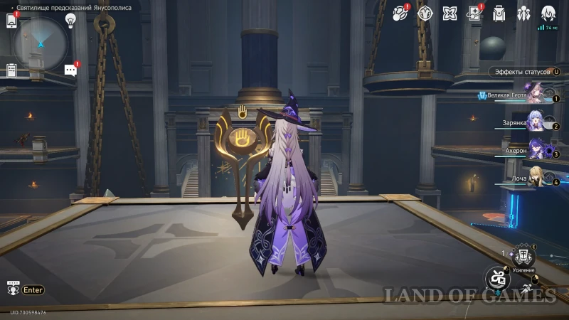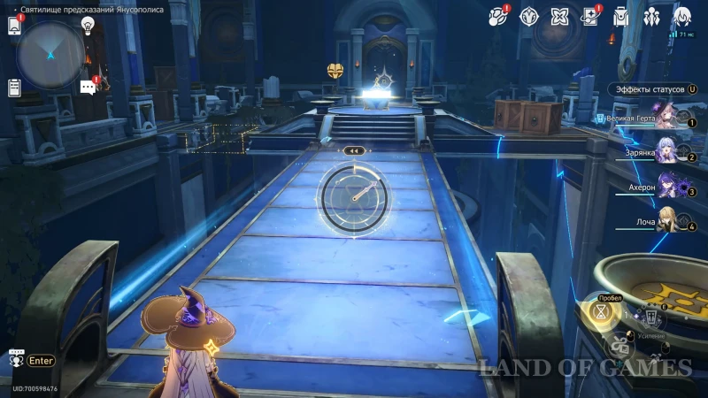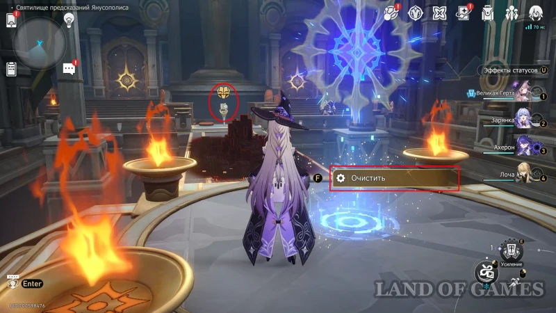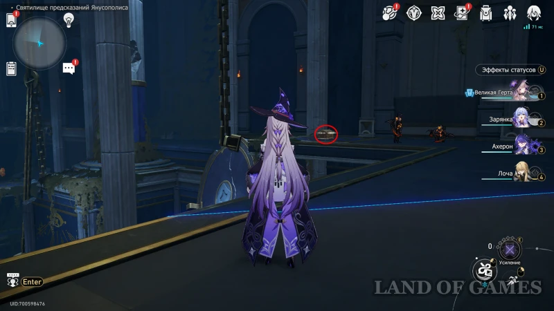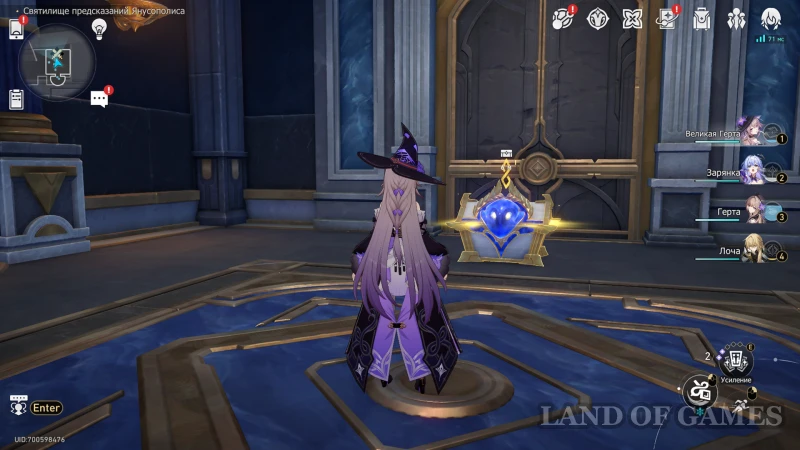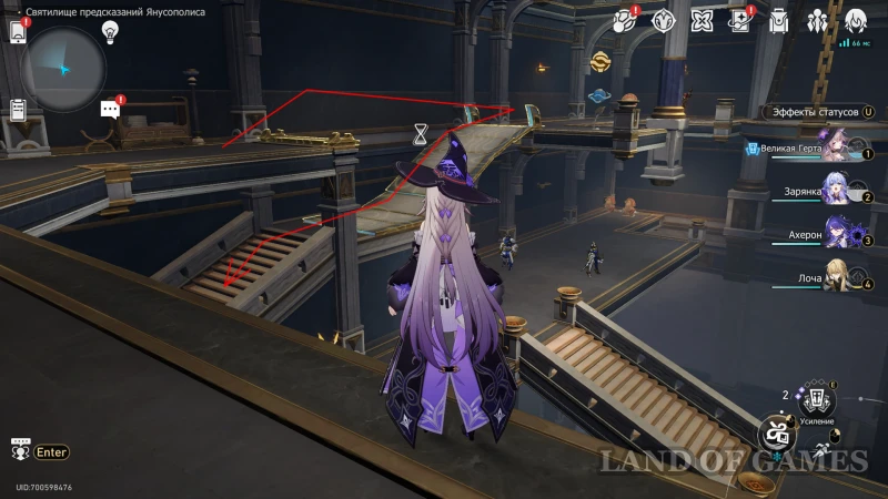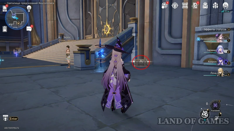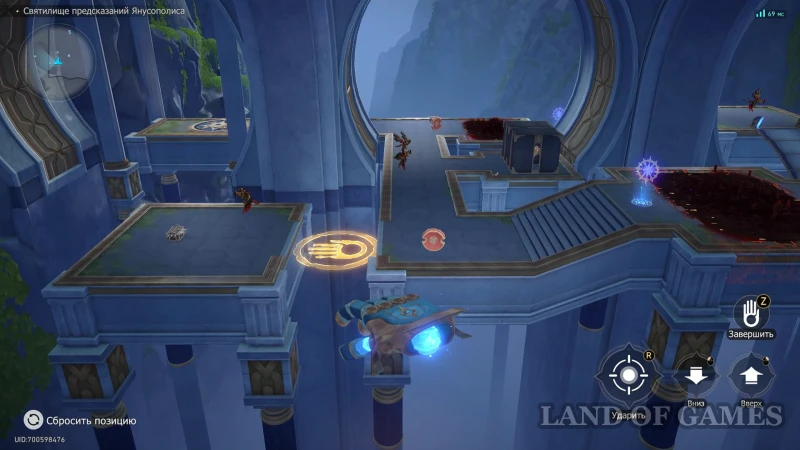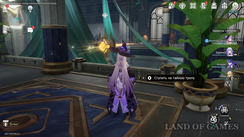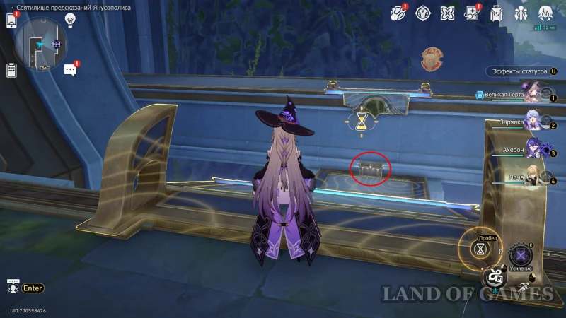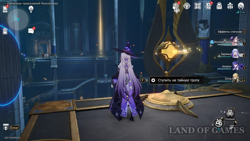 Войдя в зал с черного входа, сразу меняйте карту на Ночь (книга в центре) и поднимайтесь на средний уровень по левому крылу (там, где есть интерактивный мостик). Пройдя мимо монстров, активируйте плиту пророчества на краю этажа и соберите правильный пазл (как показано на скриншоте выше).