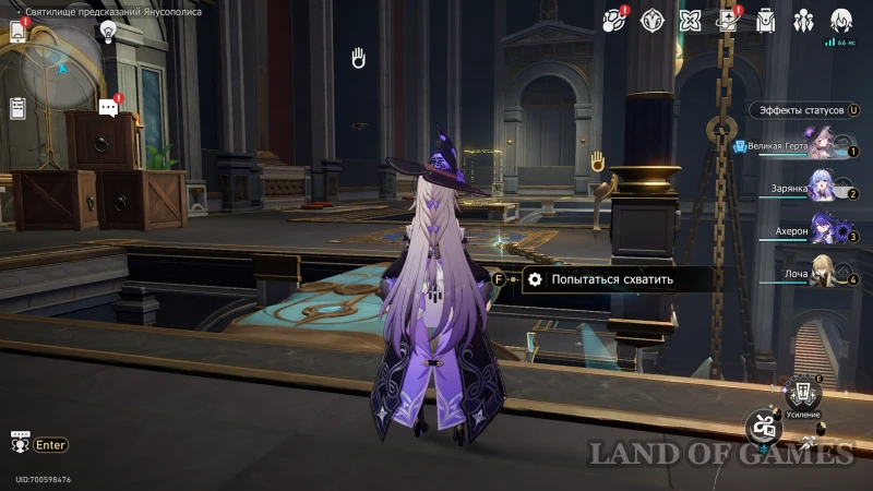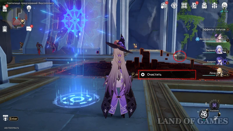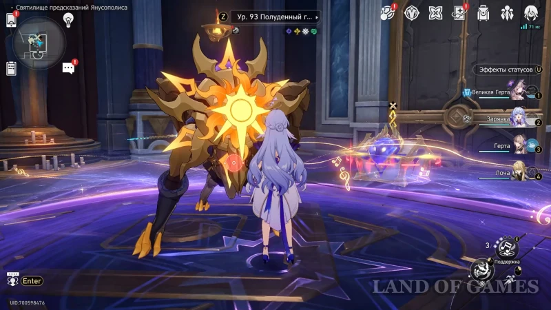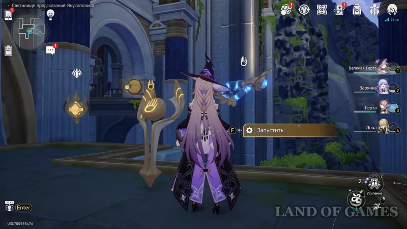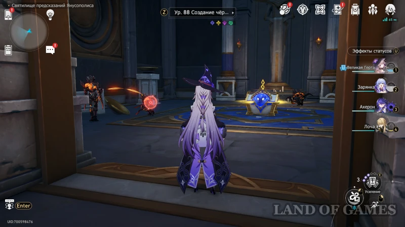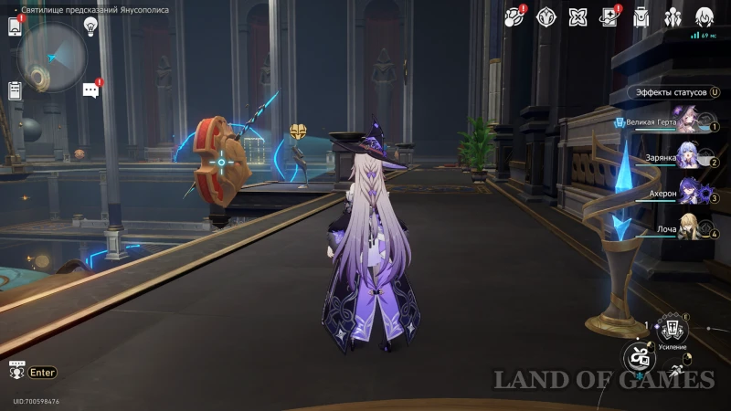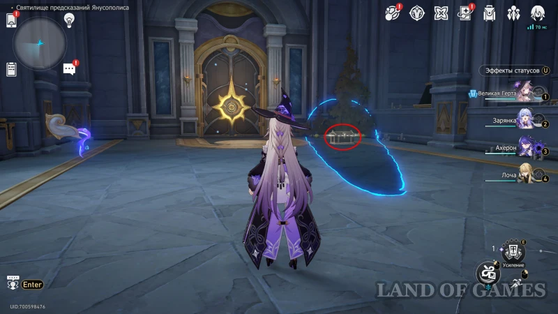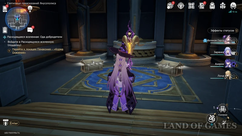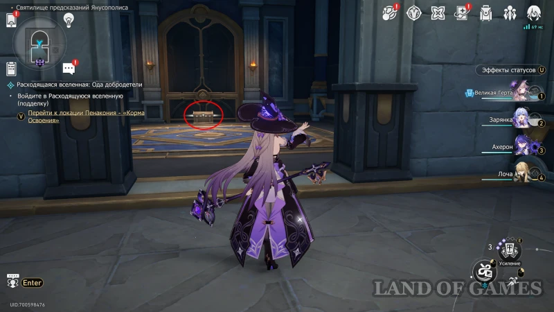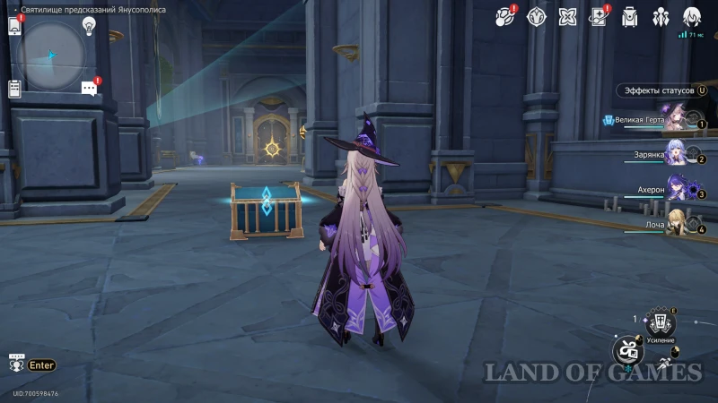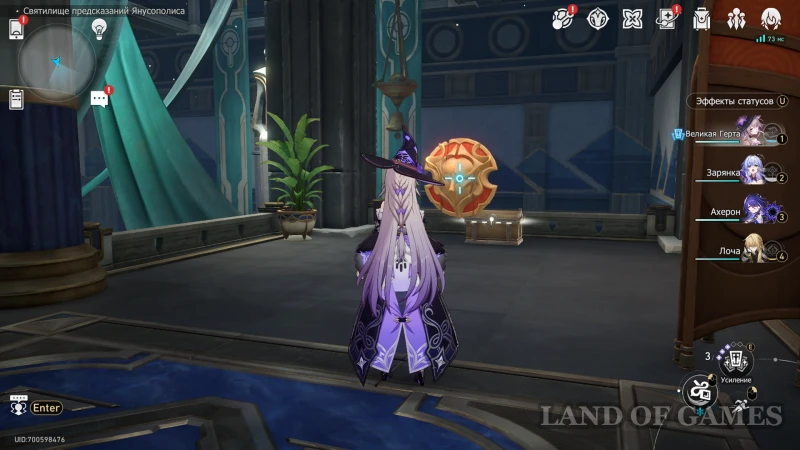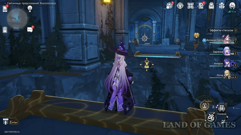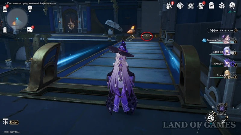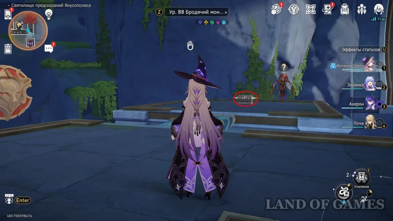 Войдя в зал с черного входа, сразу меняйте карту на Ночь (книга в центре) и поднимайтесь на средний уровень по левому крылу (там, где есть интерактивный мостик). Пройдя мимо монстров, активируйте плиту пророчества на краю этажа и соберите правильный пазл (как показано на скриншоте выше).