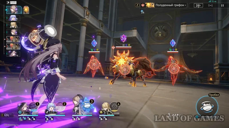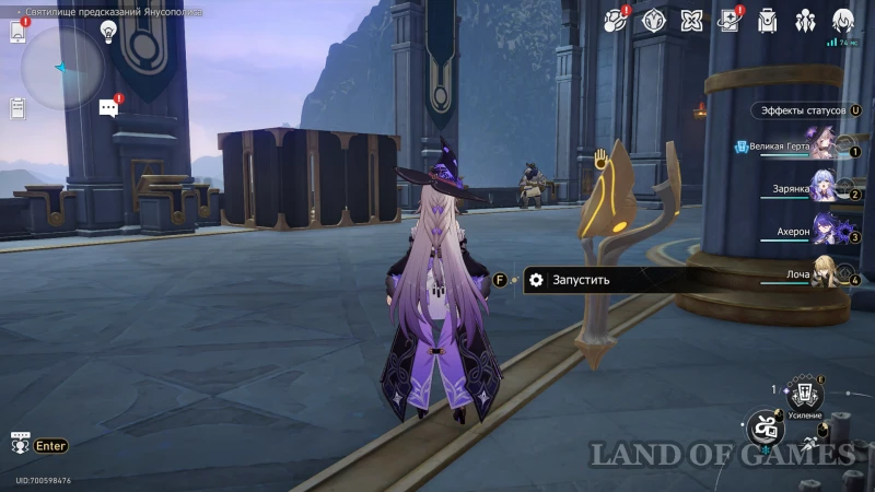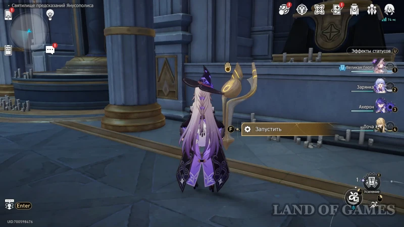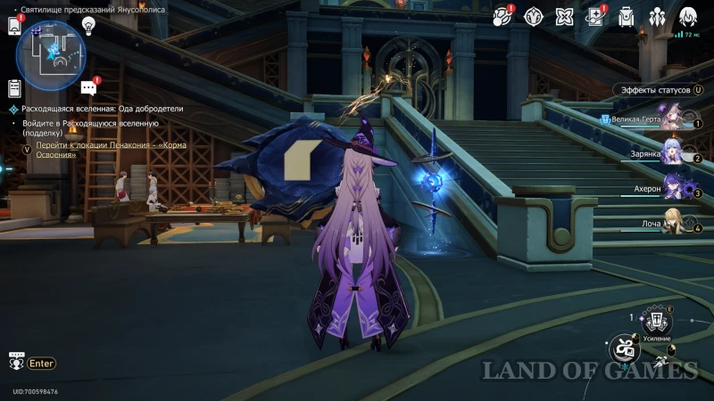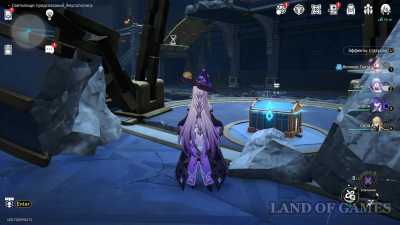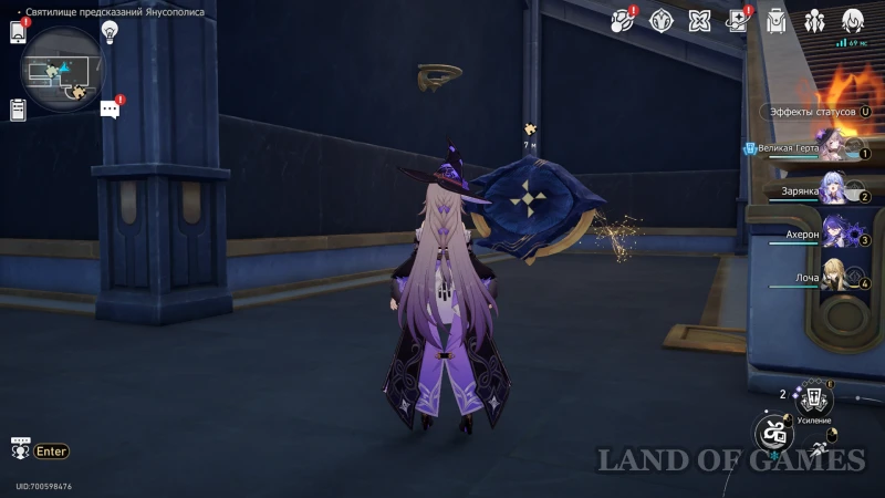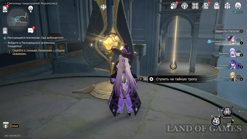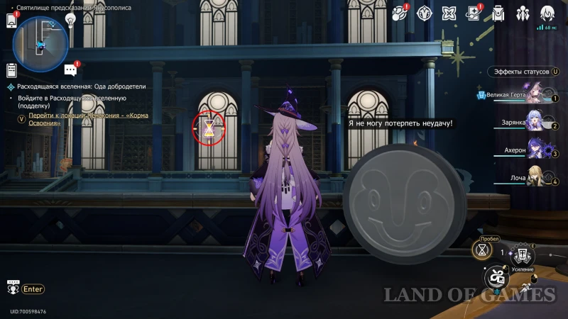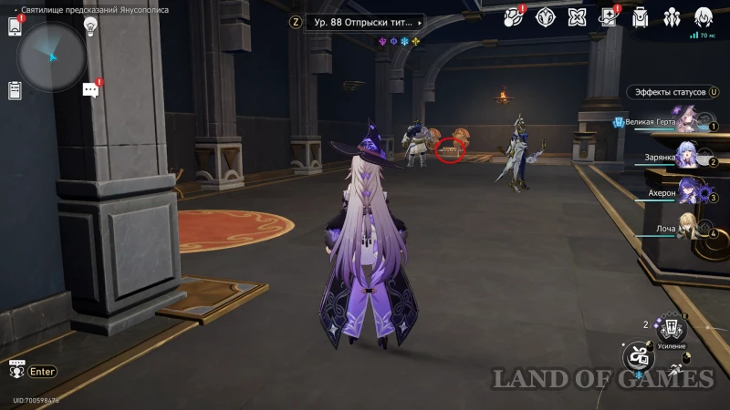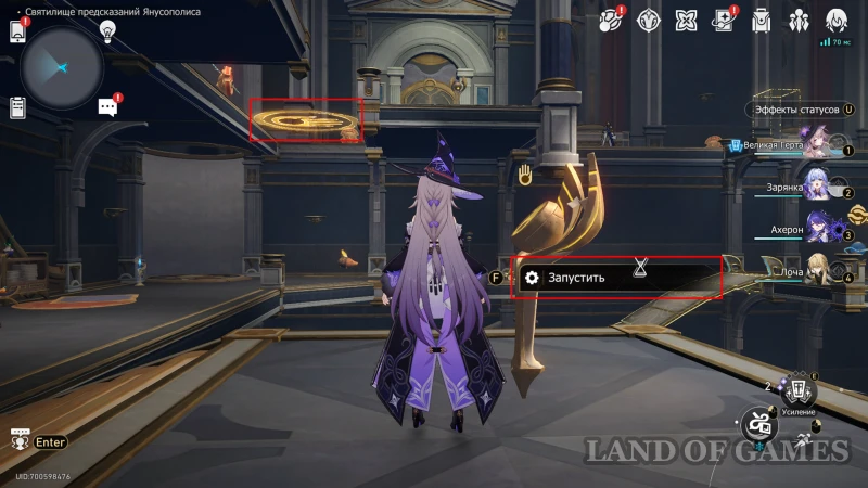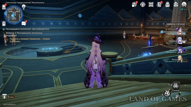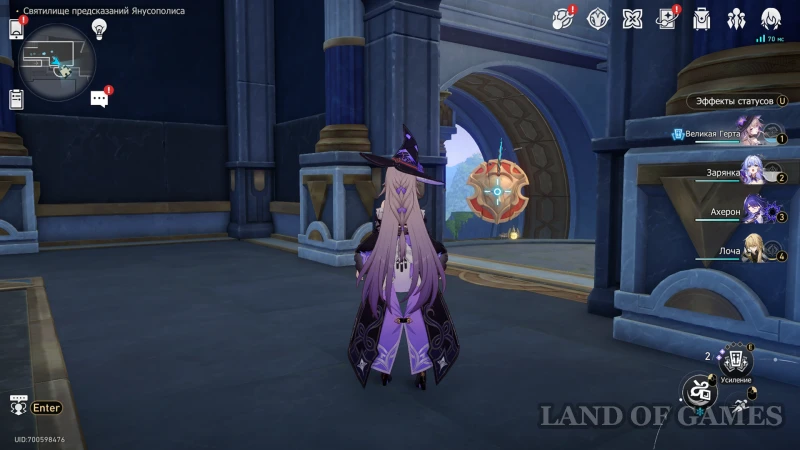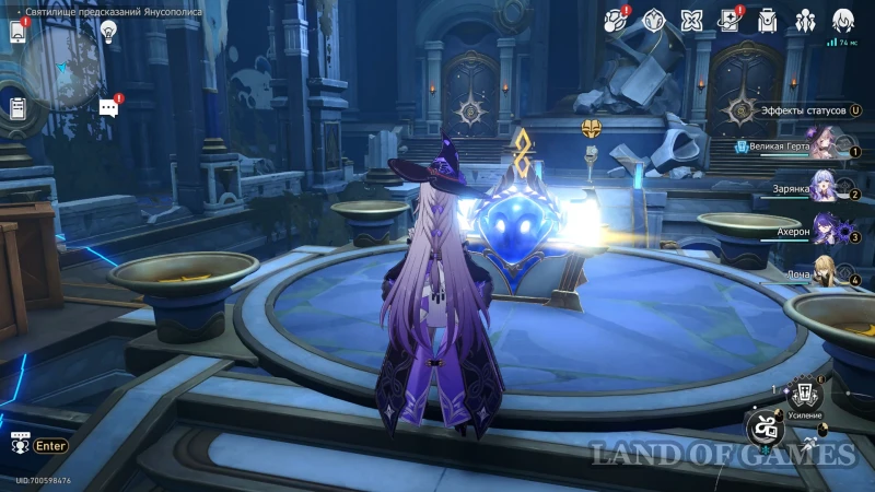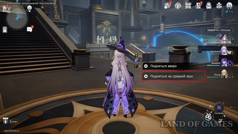 Войдя в зал с черного входа, сразу меняйте карту на Ночь (книга в центре) и поднимайтесь на средний уровень по левому крылу (там, где есть интерактивный мостик). Пройдя мимо монстров, активируйте плиту пророчества на краю этажа и соберите правильный пазл (как показано на скриншоте выше).