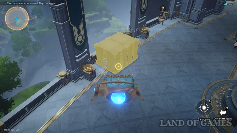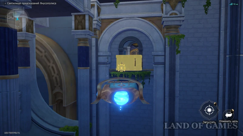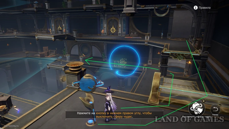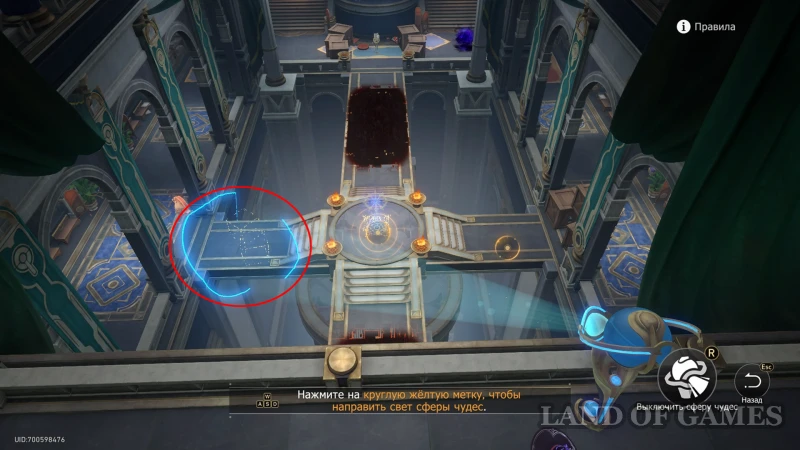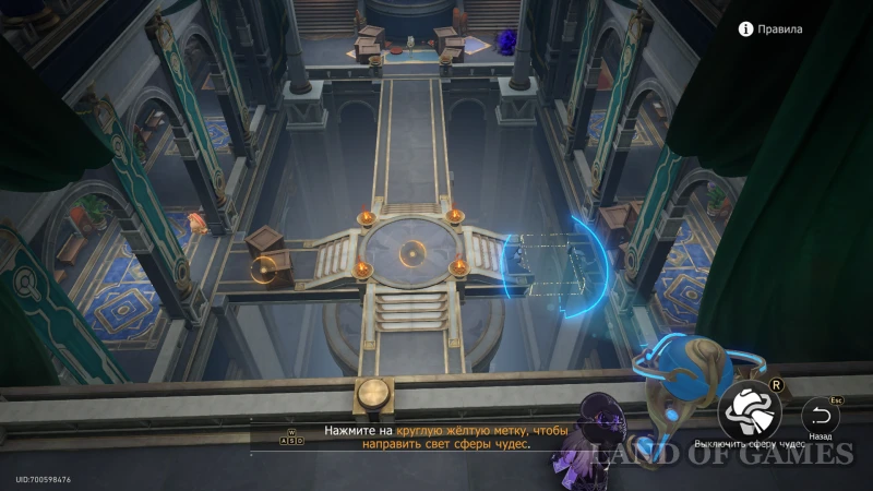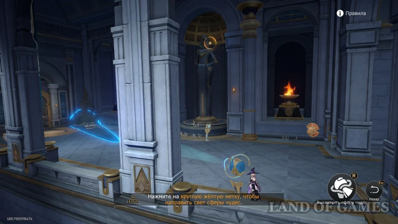 - Перед тем, как активировать ладонь, вернитесь к сфере чудес и наведите свет на лицо статуи (там будет первая монетка);