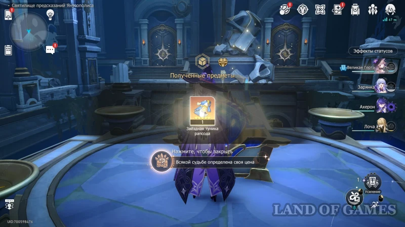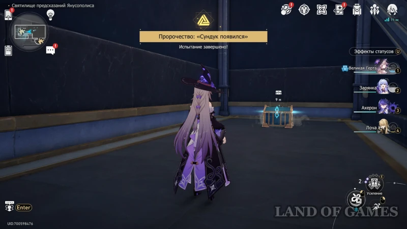 От прошлой награды пройдите до книги чудес на среднем этаже (она около участка, на которое светит прожектор), смените локацию на Рассвет и спуститесь на нижний уровень (по интерактивному мостику или лифту): под местом, где была 9-я плита пророчества, увидите несколько врагов, а у дальней стены – сундучок, заслоненный двумя щитами.