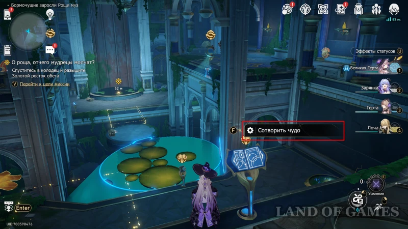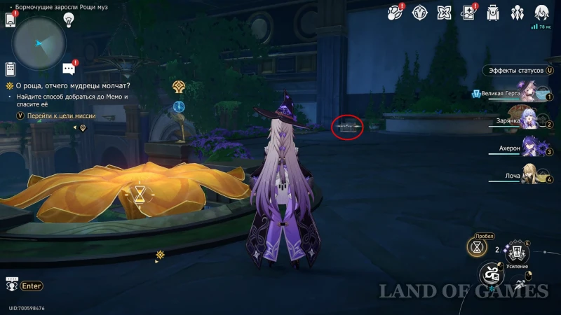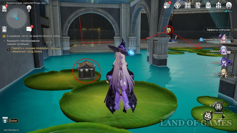 Переключите карту на светлый режим и пересеките пруд по кувшинкам, а затем сверните к месту, где была плита – перед вами будет открыт путь к сундучку.