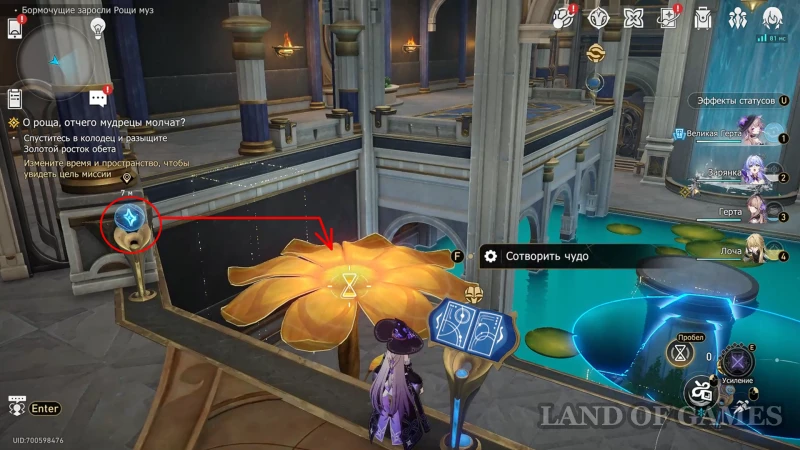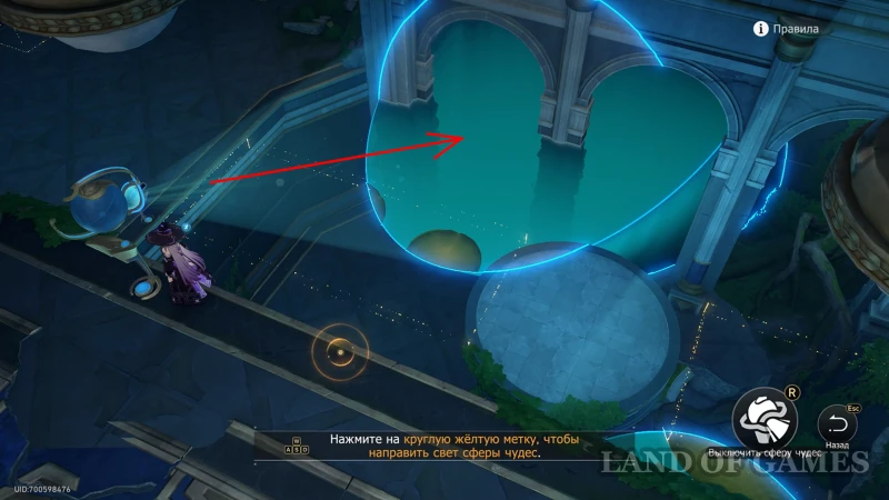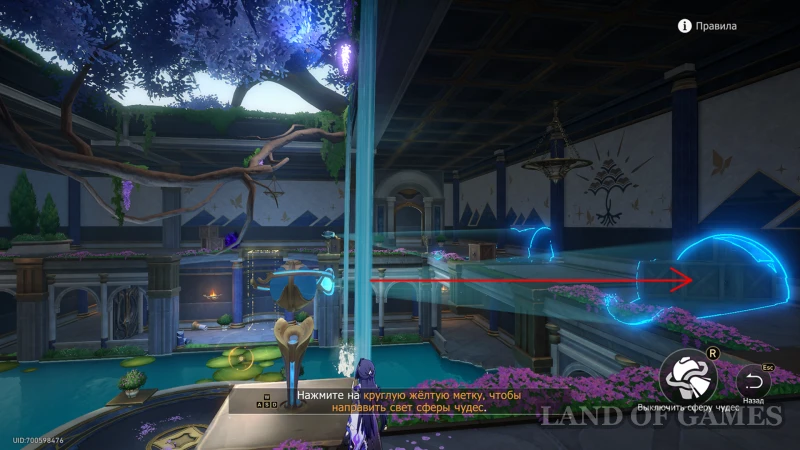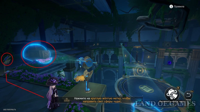 - Активируйте прожектор, с которым ранее не взаимодействовали (он светит на кувшинки перед книгой) и переведите его влево (чтобы там, где растет перекрытый камнями когницвет, была вода);