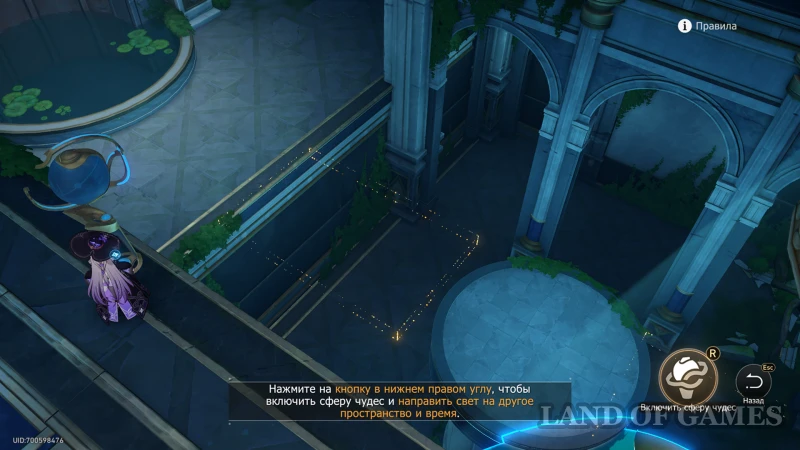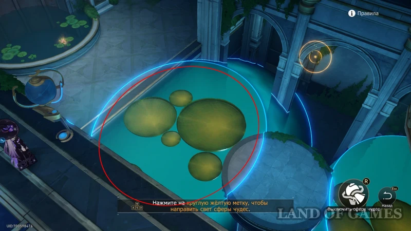Подойдите к Сфере чудес, стоящей у края балкона на исследуемом ярусе, и активируйте прожектор (он должен быть направлен на кувшинки по центру пруда). Остается спуститься по цветку к кувшинкам и перейти по ним на противоположную сторону зала – обычный трофей ждет вас около умывальни.