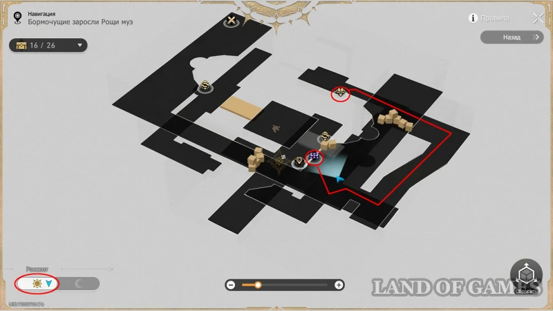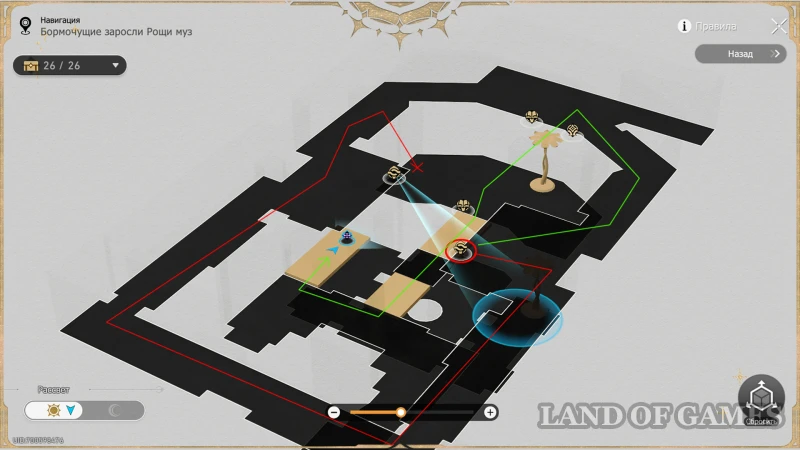 Окончательно перемещаемся к «Куполу верности» (по центру рощи на 3 этаже) и бежим на западную 3D-карту: для получения 23-го трофея вам нужно использовать книжку чудес (стоит прямо перед входом) и поменять локацию на Рассвет, а после бежать влево и на второй этаж – сокровищница стоит около второй книги на верхнем ярусе.