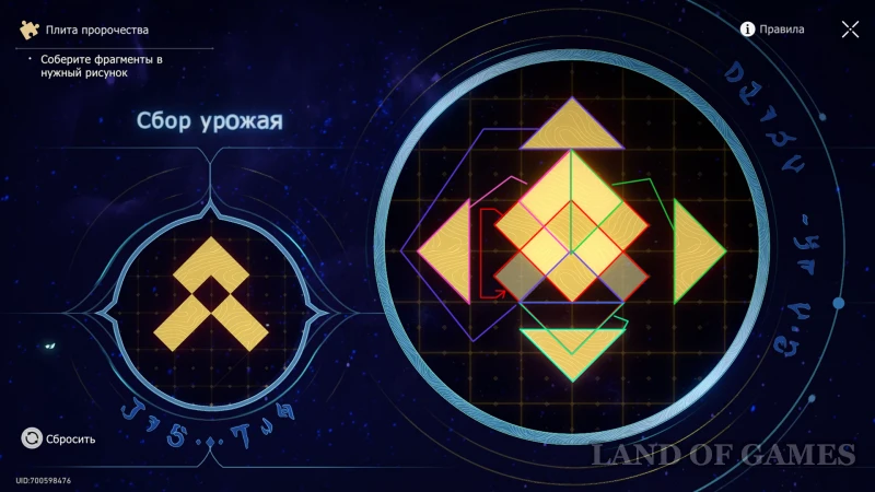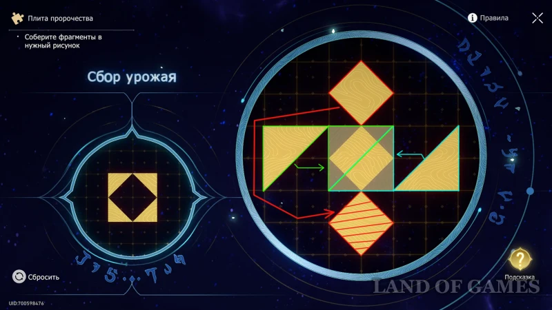На участке с найденным перед этим золотым дротиком, вы сможете отыскать Плиту пророчества (помечена на карте) – она размещена по правой стороне здания. Используйте подсказку к пазлу «Сбор урожая», поставьте все элементы рисунка на места и получите за решение ценную сокровищницу.
