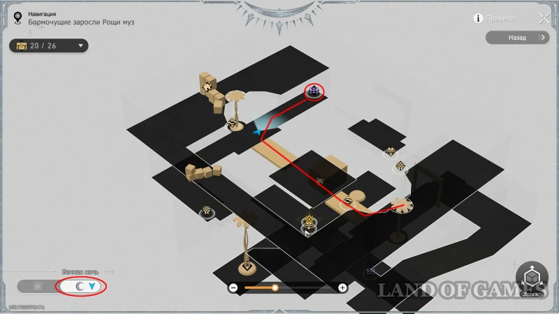 Сверху поменяйте режим карты на Вечную ночь, а потом поверните направо и двигайтесь до противоположной стены – тут будет стоять двадцать четвертый ларец.