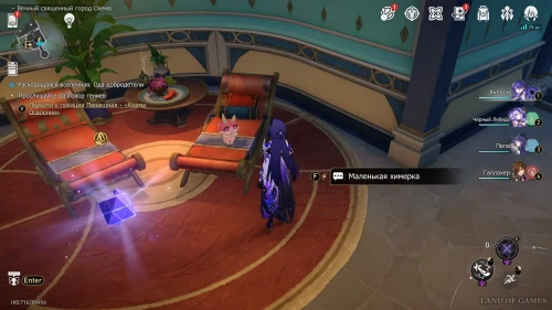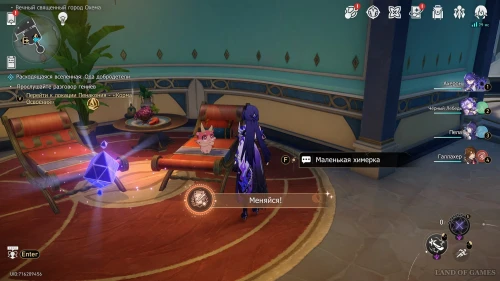 Меняйся! – Поймите, что говорит химера в личной купальне. После завершения событии «Наш ау-у-утряд» и покупки Большого таинственного подарка за 15 осколков памяти у Янусова коня возвратитесь в свою личную купальню возле якоря «Зал отдыха». Здесь отыщите Маленькую химерку, которая будет либо сидеть на шезлонге, либо отдыхать рядом с бассейном, и поболтайте с ней.