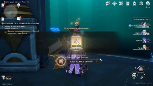 Улов из моря знаний – Отыщите сундук с сокровищами, спрятанный глубоко под водой в Бормочущих зарослях Рощи муз. В деталях о том, как это сделать, мы рассказали в отдельном руководстве по сундукам в этой локации (указан под номером 11).