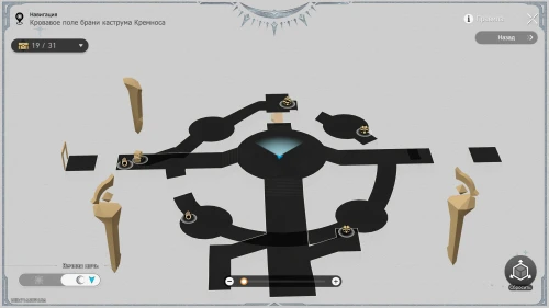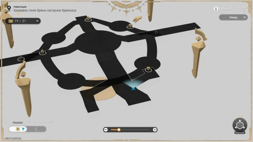 Затем переместитесь к якорю «Парадная арка ковки душ» в Кровавом поле брани каструма Кремноса. Далее двигайтесь на запад в огромное помещение с трехмерной картой. Войдя внутрь, спуститесь немного вниз и подберите с пола справа рукопись, чтобы разблокировать трофей.