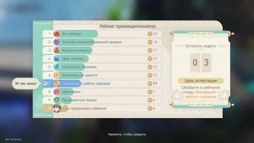 Разобравшись с аристократом, направляйтесь к Ариэль, садовнице из Сада жизни, и поболтайте с ней. Можете выбрать любого персонажа смотрителем, так как вы в любом случае займетесь управлением. Вы увидите рейтинг отрядов. Окажется, что ваша команда на последнем месте. Вам необходимо будет обойти за 3 недели команду «Сбежавший с работы стражник».