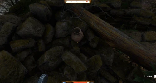 Если повернуться спиной к сундучку, то прямо перед вами окажется поваленное дерево. Рядом с кустом, с левой стороны от него, находится кувшин. Внутри этой емкости находятся 3 паутины, грецкие орехи и, что самое важное, ключ от сундука.