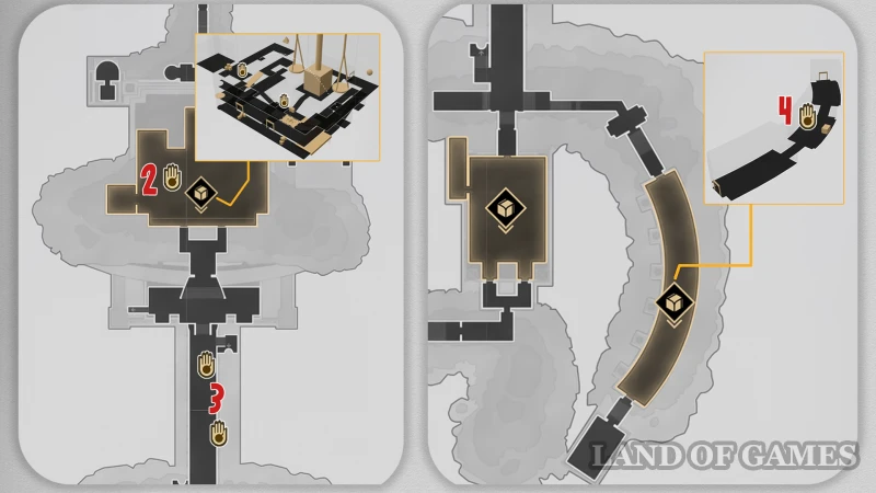 И последний, четвертый механизм можно запустить внутри вытянутой 3D-карты на юго-востоке Святилища (якорь «Конец пути»). Убедитесь, что локация переключена на режим Рассвета. Закончив с поисками, вы также получите ценный сундучок. Приступим к поиску трех монеток причуд: