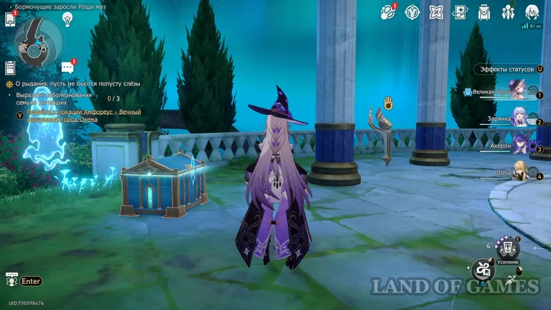 В Роще муз есть всего одно место, в пределах которого можно управлять роботизированной рукой — это площадка с колоннами на северо-востоке 2 этажа древа. Активируйте механизм около пруда и отправляйтесь на поиски трех жетонов причуд, а после заберите ценный ларец около пульта.