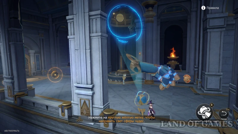 Перед тем, как активировать ладонь, вернитесь к сфере чудес и наведите свет на лицо статуи (там будет первая монетка).
