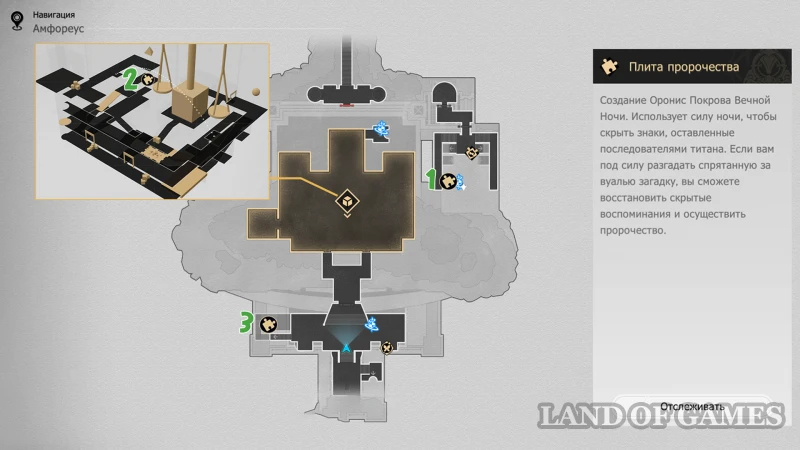 Вторая плита находится внутри трехмерной карты на северной половине Святилища (между «Тайным проходом размышления» и «Вратами судьбы») — мы расскажем, как добраться до нее по более длинному пути от северного якоря: войдя в зал с черного входа, сразу меняйте карту на Ночь (книга в центре нижнего этажа) и поднимайтесь на средний уровень по левому крылу (где интерактивный мостик). Пройдя мимо монстров, активируйте плиту пророчества на краю этажа и соберите правильный пазл по описанным ниже инструкциям.
