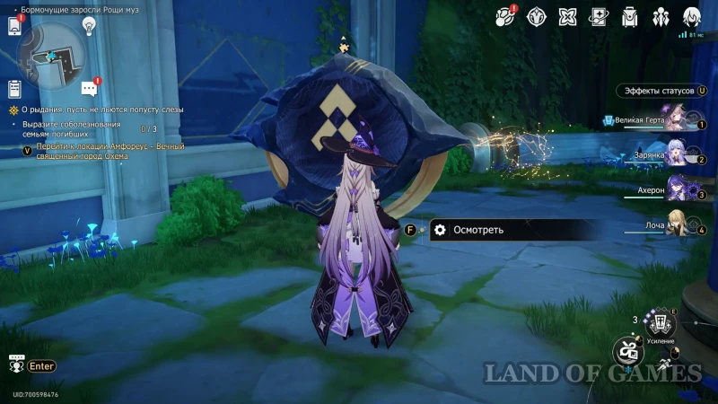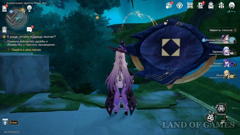 Переместитесь к данжу «Застойная тень: Форма ледяной луны» на востоке рощи, двигайтесь через проход на запад и сразу сверните влево: в коридоре будет несколько врагов, а за поворотом – четвертая плита пророчества. Воспользуйтесь инструкцией к подсказке на скриншоте ниже, а когда все части рисунка будут на местах, поднимайтесь по корню дерева на второй этаж, попутно собрав ценный ларец.