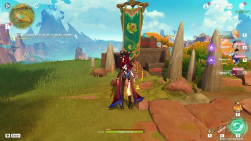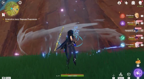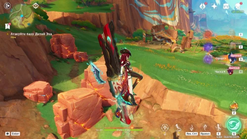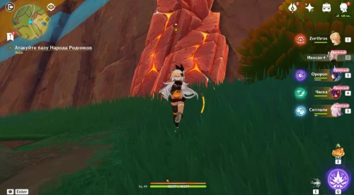 Спланируйте вниз к левой стороне подножья горы, на которой находится вражеская база (нужная точка показана на скриншоте выше). Затем переключитесь на Кинича и используйте его навык, чтобы притянуться к четырехлистным печатям и забраться на верхушку скалы. Тем самым вы сможете подобраться к противникам с задней стороны.