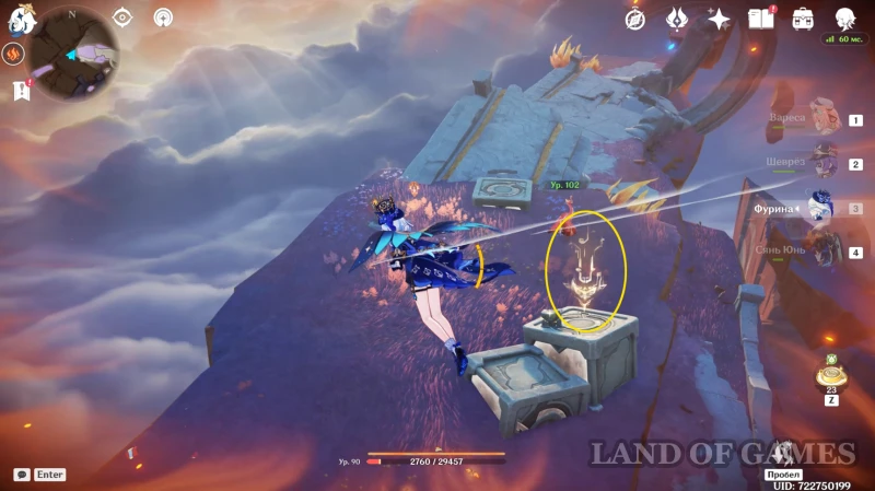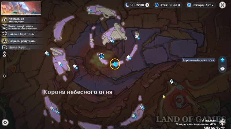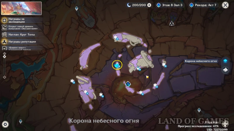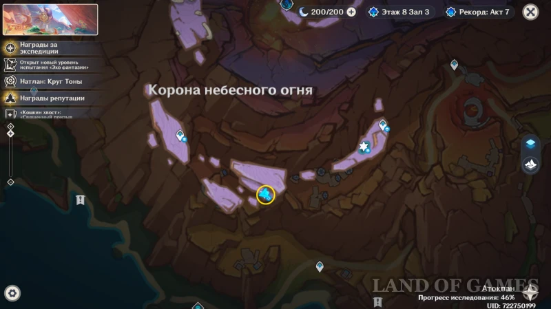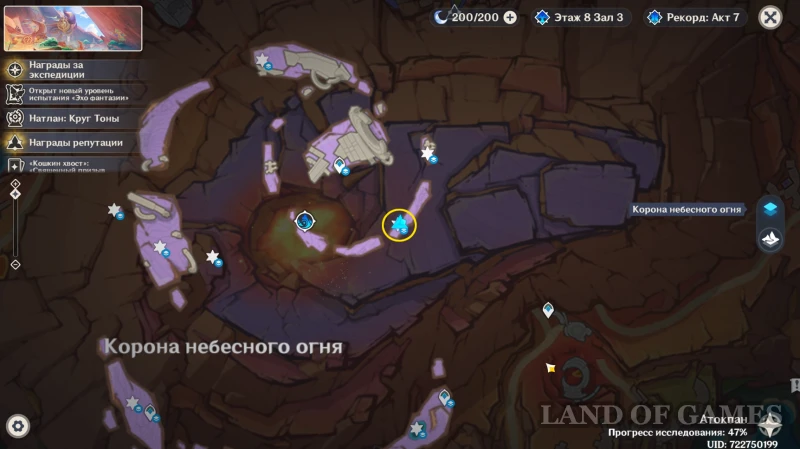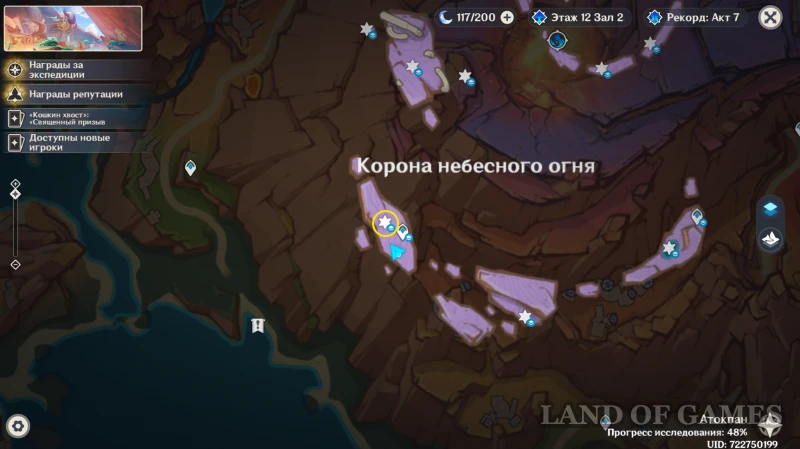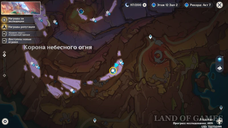 На Короне небесного огня есть 10 золотистых печатей— на карте выше можно ознакомиться с примерным расположением каждой из них. Ниже отдельно рассмотрим все места.