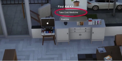 Переключитесь на больного зои и взаимодействуйте с аптечкой. В зависимости от болезни у вас появится соответствующая опция: принять лекарство от простуды или от аллергии.