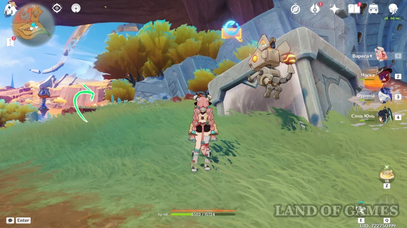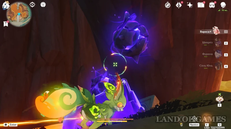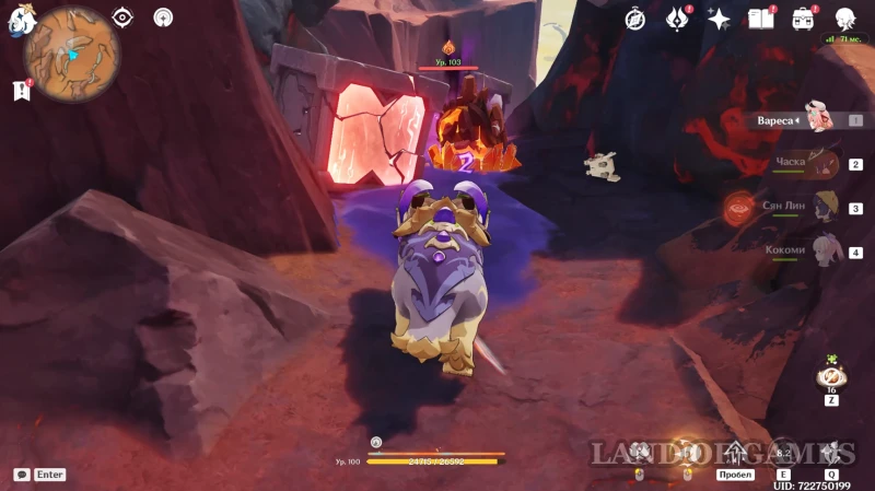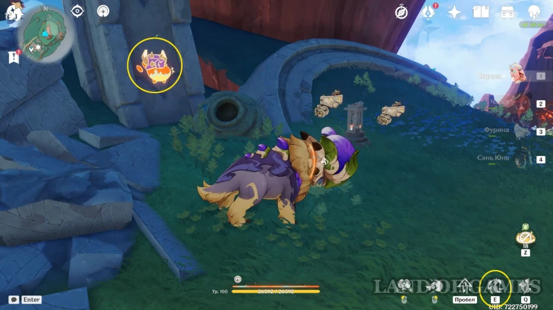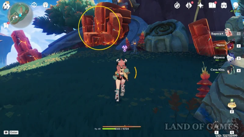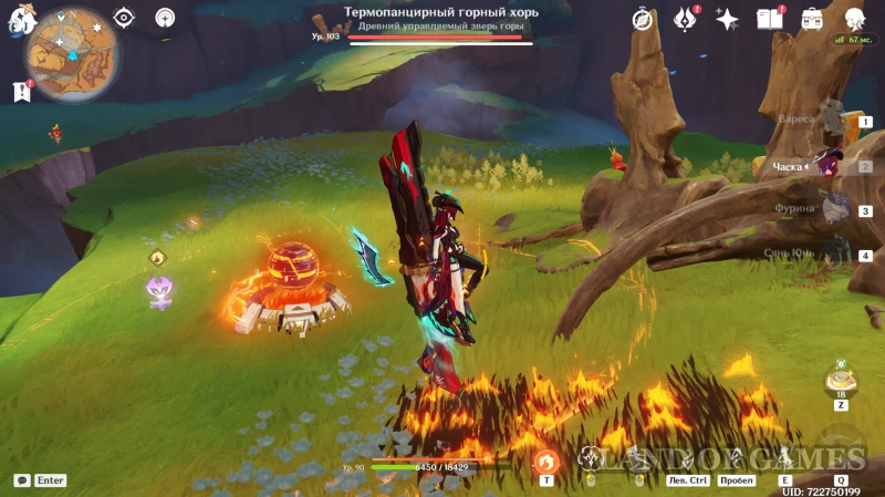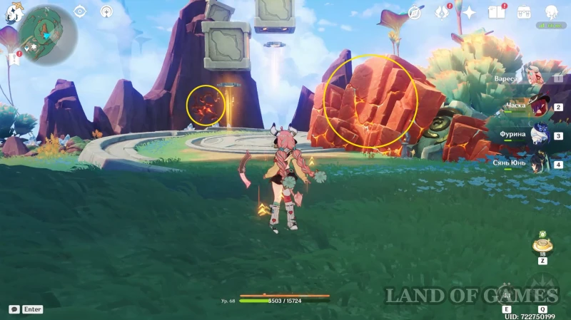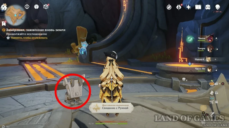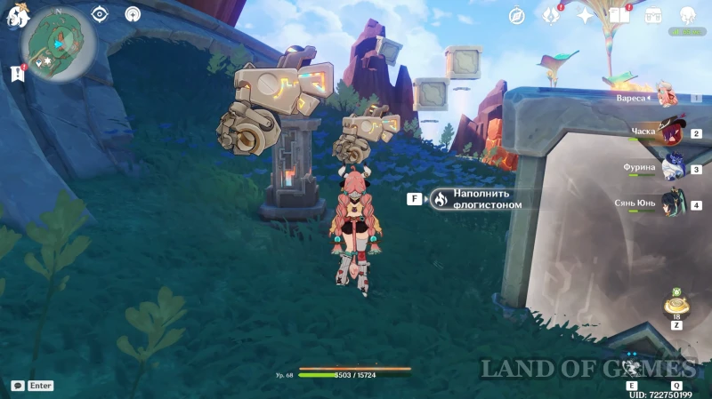 Разбейте силами рогатого завриана все оранжевые глыбы и найдите скопление энергии между позвонками откопанного под пульверитами хребта – на него нужно воздействовать (наполнить) флогистоном. Затем победите появившегося термопанцирного горного хоря и заберите награды (его проще бить атаками в падении, как у Сяо, Варесы или Ка Мина).