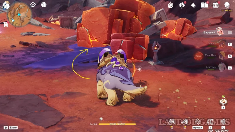 Загадка со вторым дракончиком находится к востоку от Статуи Архонта на Атокпане: бегите к лавовому кратеру, пробудите дракона взрывом и следуйте за ним в пещеру. Далее вас ждет цепочка активностей с геотермальными очагами, пульверитом и радужной надписью – весь процесс решения вы разобрали в отдельной статье.
