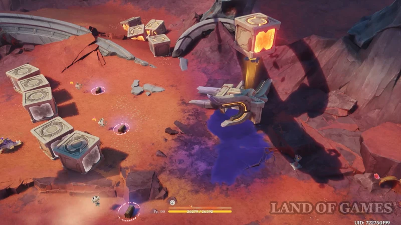 Затем проломите путь к лавовому голему, который затаился в ущелье к северу от туловища дракона (ломаем на пути пульвериты и треснувшие кубы). Одолейте монстра и наблюдайте, как вторая деталь летит к корпусу.