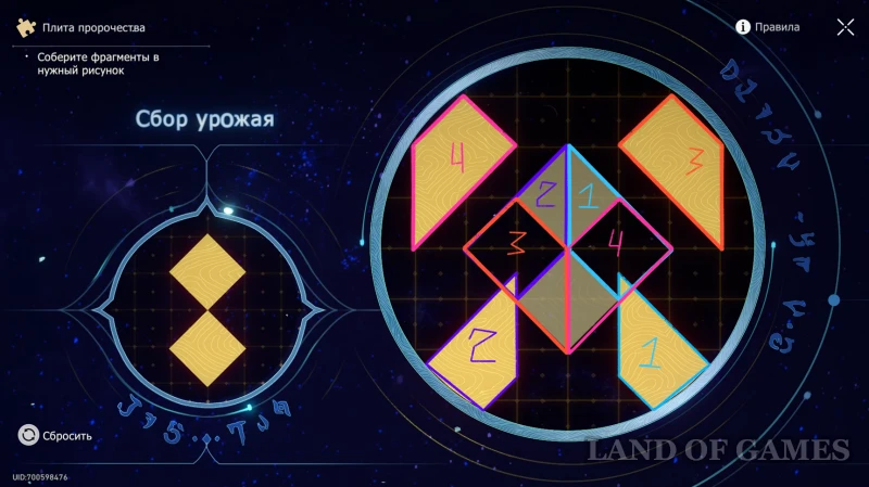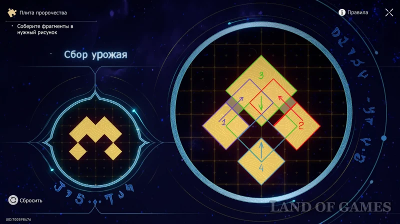 Ориентируясь на метку головоломки в том же помещении, где был собран предыдущий сундучок, начните решение Плиты пророчества «Сбор урожая» (на верхнем скриншоте мы показали, куда следует переместить все элементы пазла). После решения появится ценная сокровищница.