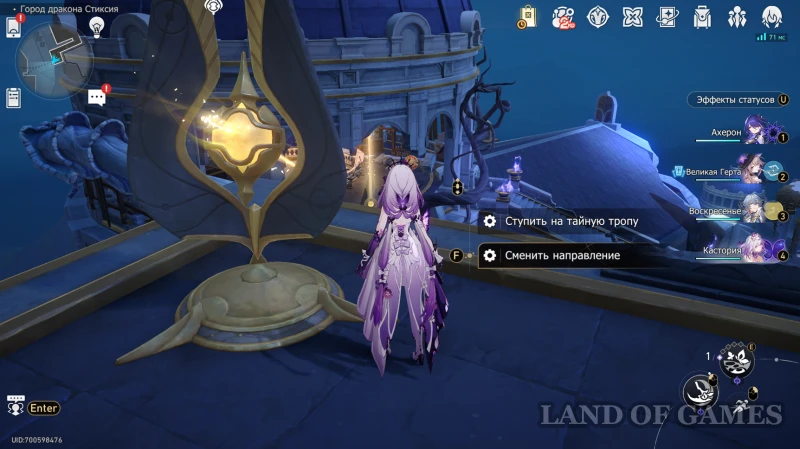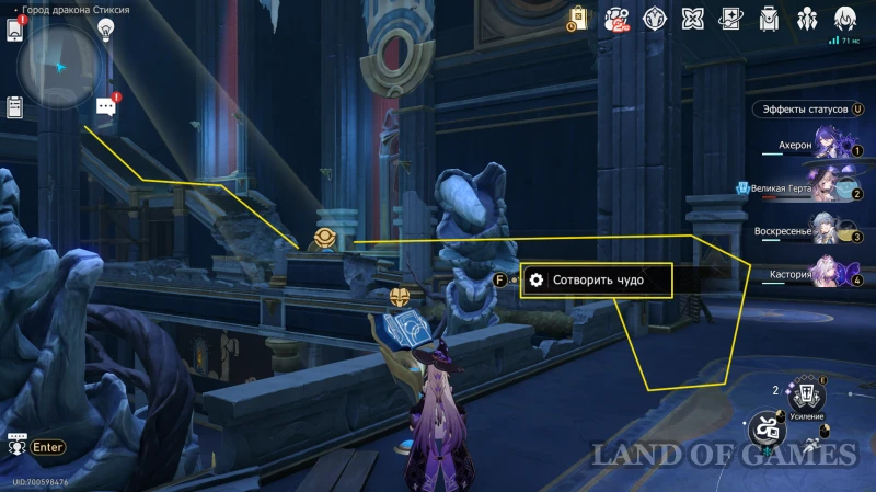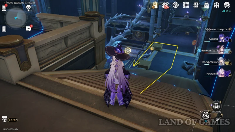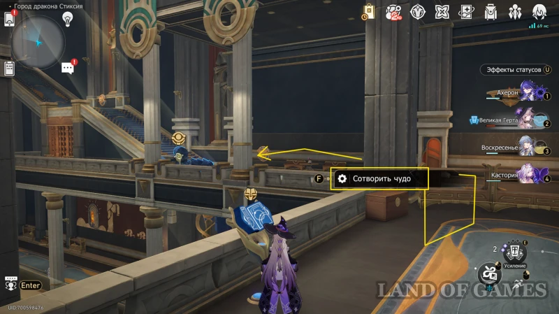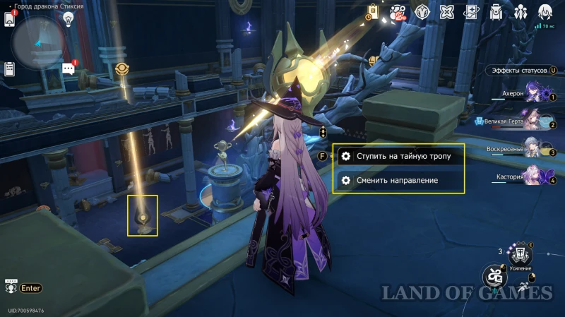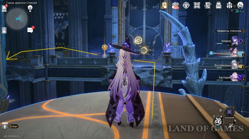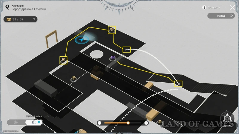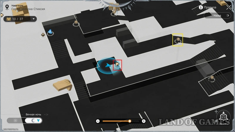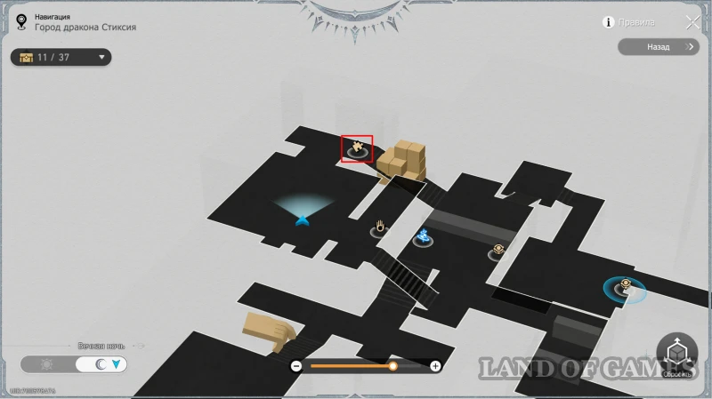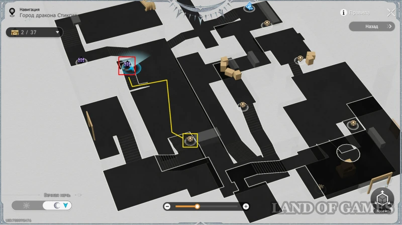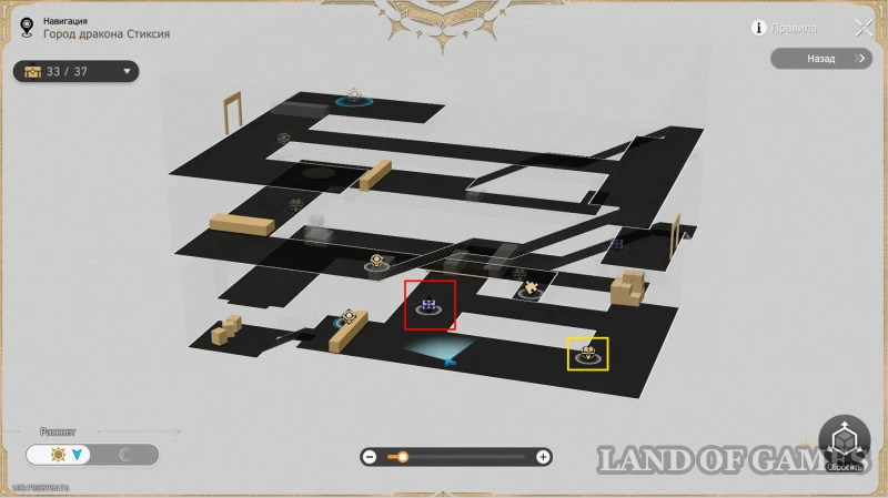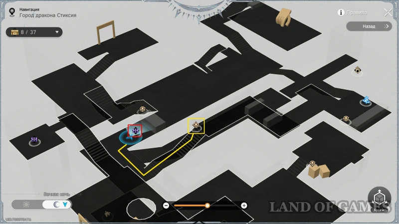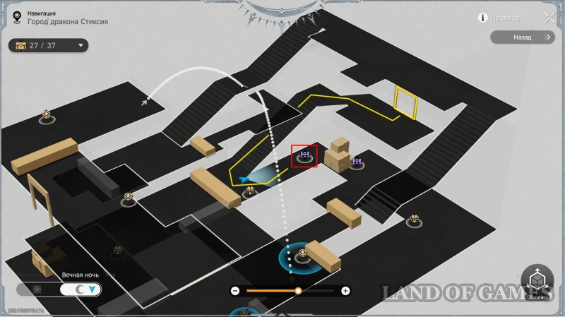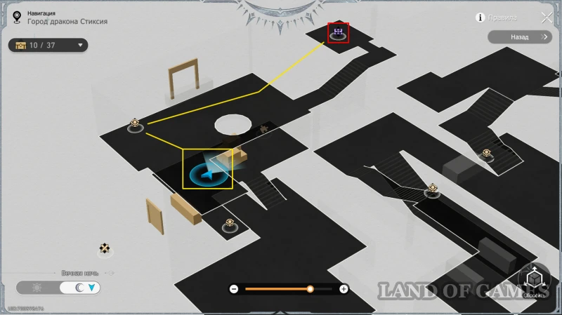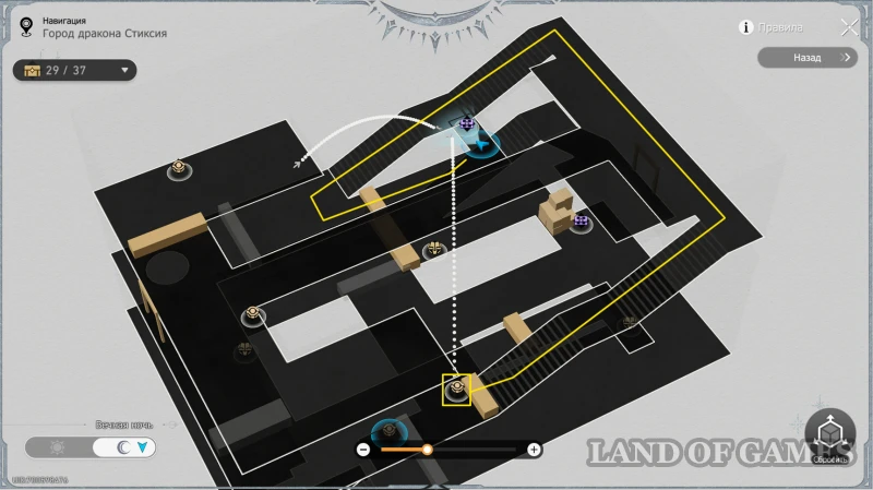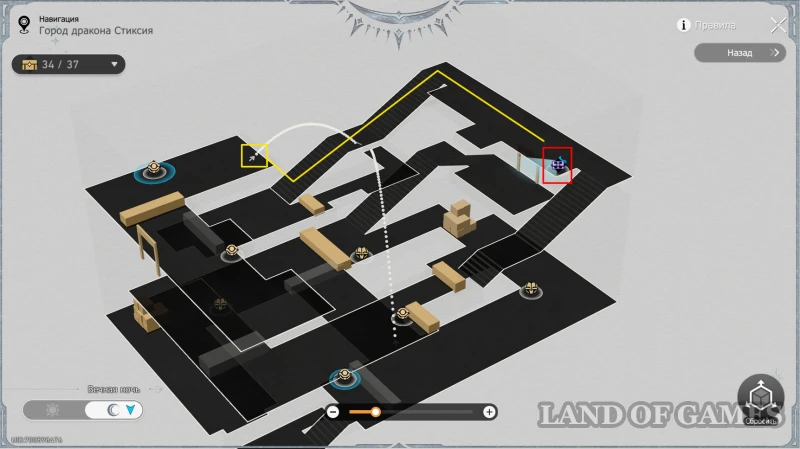 Вновь спускайтесь к Книге чудес и, не меняя режим карты, двигайтесь вперед к круглому подъемнику. Переместитесь на этаж выше и активируйте вторую книжку, чтобы переключить зал на Вечную ночь, а после идите к Маяку чудес перед разрушенной лестницей — справа от него найдете обычный трофей.