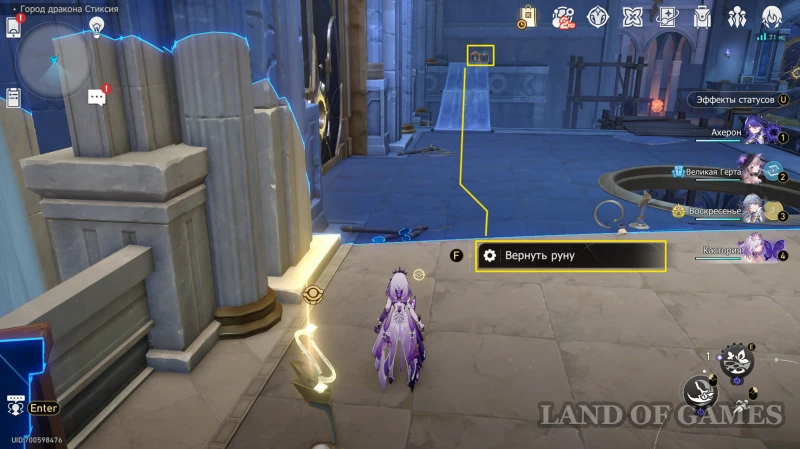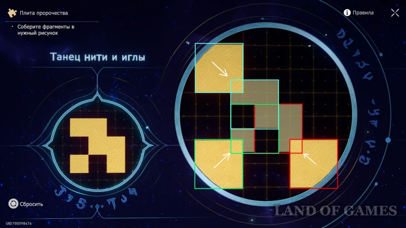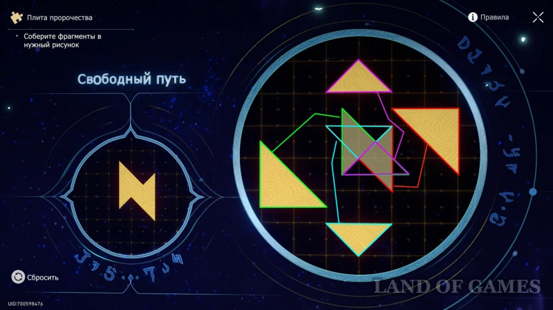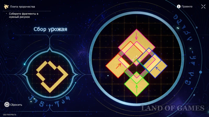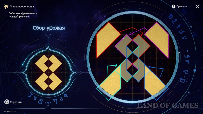 Вернитесь к мини-телепорту на здании с предыдущей наградой, перенаправьте его вниз и спуститесь на круглую террасу. Тут вас ждет Плита пророчества «Сбор урожая» — соберите пазл, как это указано на скриншоте выше, и получите в награду одну ценную сокровищницу.