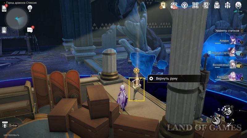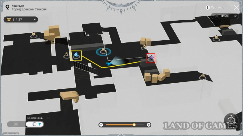 - Возвращайтесь по уже знакомому пути на место получения 40-го сундука, возьмите руну в режиме Вечной ночи и идите через воду влево — так вы попадете в тупик с сокровищницей.