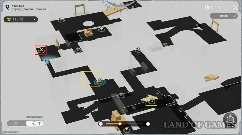 - Разрушьте подставку с каменным шаром около лифта на 1-м ярусе сокровищницы, чтобы сломать ящики снизу (в режиме Рассвета);