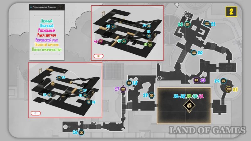 Эта локация состоит из нескольких уровней, в которых можно отыскать 41 обычный, ценный и роскошный сундук. На карте ниже можно будет посмотреть их примерное расположение.