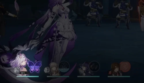 После применения умения «Тишина прикосновения сумрачного мотылька» героиня тратит 30% от текущего здоровья всех союзников и наносит квантовый урон в размере 25-62,5% и 15-37,5% от своего максимального HP выбранному врагу и соседним целям соответственно. Если текущего здоровья не хватает, то оно падает до 1 единицы. В случае наличия мертвого дракона на поле битвы это умение меняется на «Костяной коготь, объятья мертвого дракона».