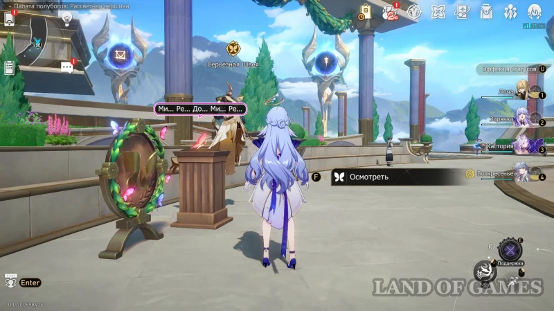 После переместитесь к якорю «Палата полубогов: Передний двор», получите награду за возвращение всех существ и постойте немного около Серьезной Швеи — через некоторое время вы услышите звук мелодии, а над головой бабочки появится партитура «Ми... Ре... До... Ми... Ре...», которую предстоит наиграть.