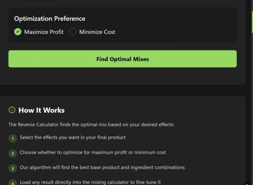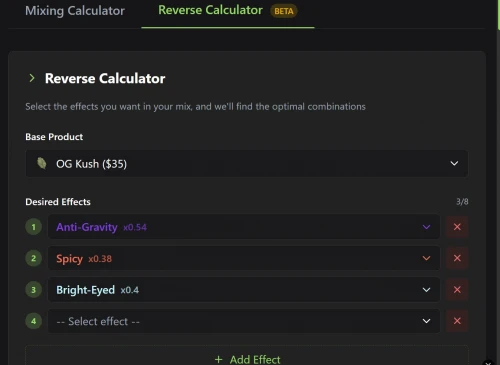 Допустим, вашему клиенту требуется продукт с такими эффектами, как Антигравитационный, Острый и Светло-глазый. В этом случае вы можете просто воспользоваться калькулятором, доступным по ССЫЛКЕ. Перейдите на вкладку «Reverse Calculator», выберите нужный базовый продукт (Base Product), например, OG Kush, а затем добавьте ему желаемые эффекты (Desired Effects).