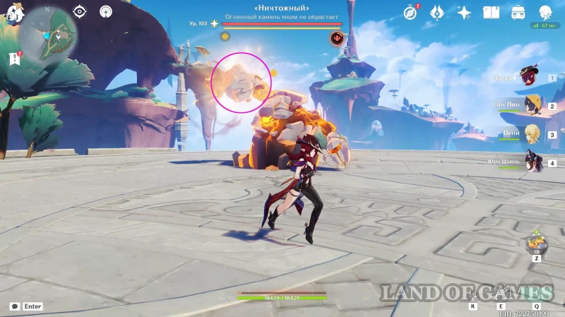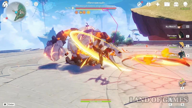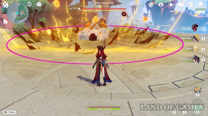 Ничтожный — это баффнутая версия Воплощения лавы, которую «наградили» двумя щитами: гео, отображаемым в виде золотистой полоски под ХП, и пиро (темно-красное колечко под правым краем шкалы здоровья). Пока монстр защищен ими, сопротивление любым атакам будет повышено с 10% до 130%. Его основной источник урона — гео. Рассмотрим все атаки подробнее: