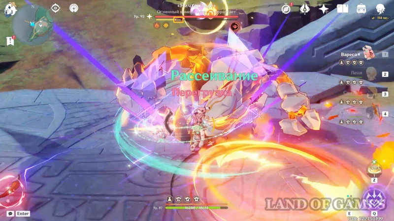 В идеале вам нужно сбить боссу сразу два щита. Эту задачу сильно упрощает наличие в команде пиро и дендро героев: повесив на врага горение, которое будет постепенно истощать шкалу термической энергии, вы можете сосредоточиться на атаках по гео щиту и таким образом параллельно ломать обе защиты.