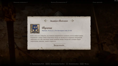 Количество стопоров, которые необходимо закрепить, будет зависеть от сложности замка: очень легкий – 1 штифт, а очень сложный – 5 штифтов. Для перемещения отмычки вы можете использовать мышку, клавиатуру (AWD) или стик джойстика, а для закрепления штифта нажимать ЛКМ, клавишу «Пробел» или кнопку «А» («Х»).