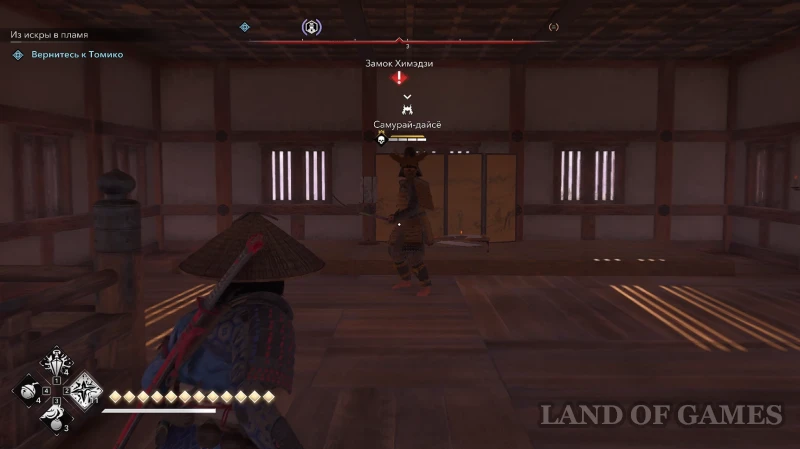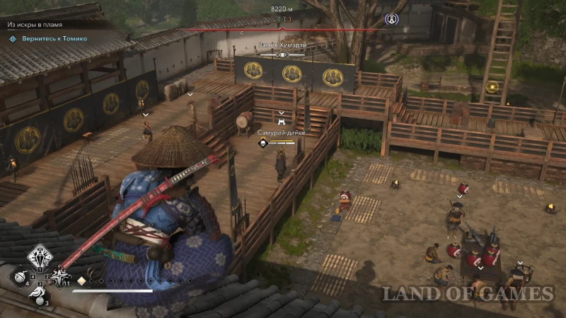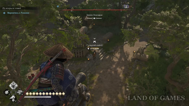 Первого врага можно обнаружить на тренировочном полигоне к западу от главной крепости: самурай стоит на деревянной террасе, и вокруг него довольно много солдат. Чтобы быстрее избавиться от противников, используйте разбросанные вокруг красные бочонки со взрывчаткой (но перед этим обрубите колокол на вышке в северной половине площадки, чтобы враги не вызвали подкрепление).