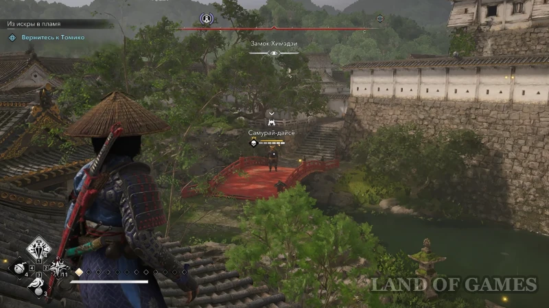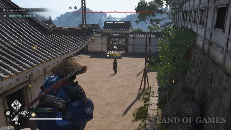 Покончив с третьим самураем, бегите по дороге на север, ориентируясь на вышку с колоколом – она стоит во дворе с четвертым мини-боссом. Убедитесь, что на шум не сбежится подмога и разберитесь с предпоследней целью.