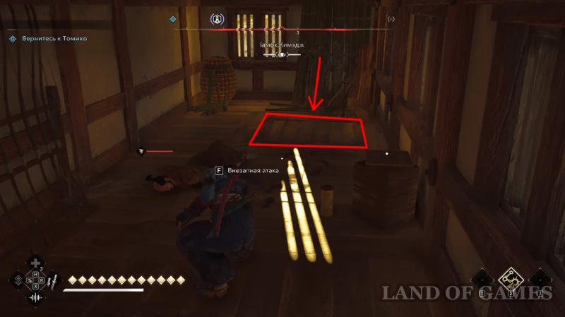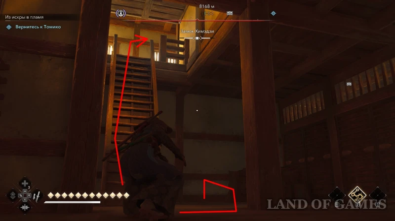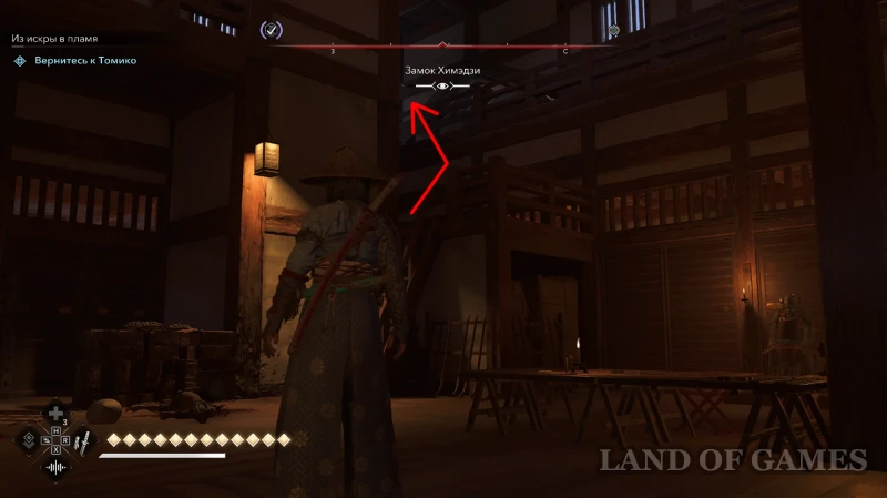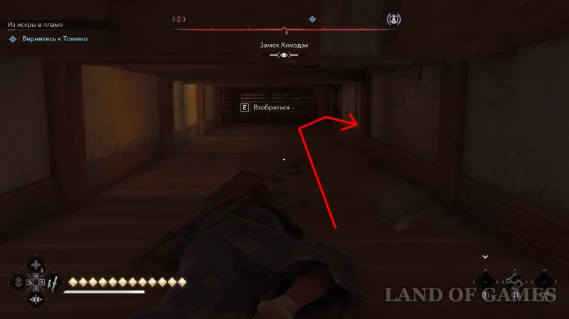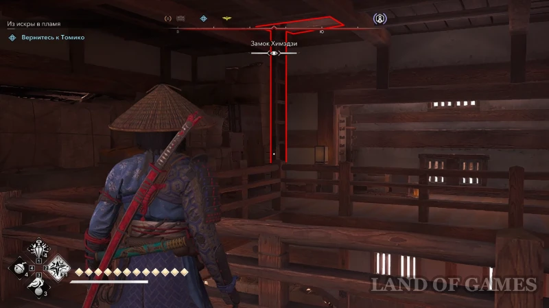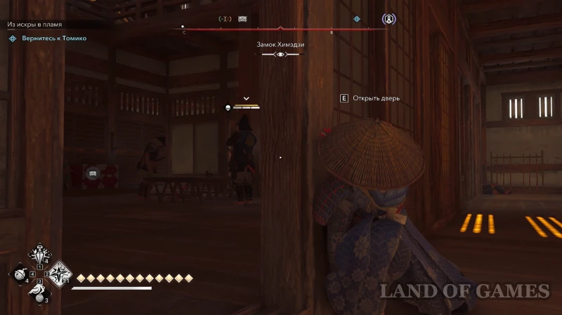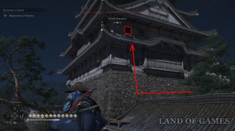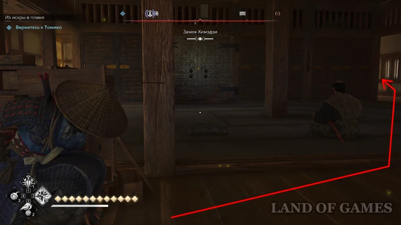 Пятый самурай находится в комнате на вершине замка. До него можно добраться двумя способами: для Наоэ самый короткий путь – залезть к точке синхронизации, затем найти на крыше люк и забраться через него в нужное помещение. А вот более длинный (который подойдет играющим за Ясукэ) мы разберем подробнее: победив 4-го самурая, поднимитесь на крышу, прилегающую к восточной стене замка, а с нее заберитесь к открытому окну на втором этаже (как показано на втором скриншоте выше).