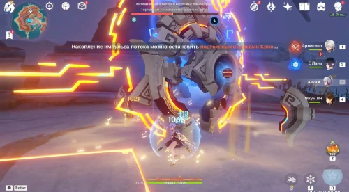 В определенный момент босс переместится в центр арены и начнет накапливать импульс, вращаясь вокруг себя и стреляя двумя лучами. В это время сразу же переключитесь на своего Крио персонажа и начните бить автоматона ледяными атаками, понижая круговую шкалу, расположенную с правой стороны от полоски жизни врага.