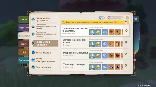 Проход в данж находится в Мондштадте, к юго-востоку от города, прямо над Побережьем Сокола – он находится на парящем островке. Взаимодействуйте с шахматной доске, лежащей на столе. Чтобы игра отметила вам его расположение, просто выберите «Недоигранная партия в шахматы» в разделе «Подземелья наказания» в справочнике искателя приключений. Войдя в него, вам необходимо будет выбрать сложность боя в зависимости от силы ваших персонажей.