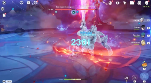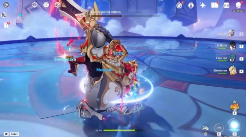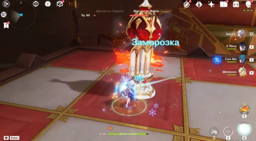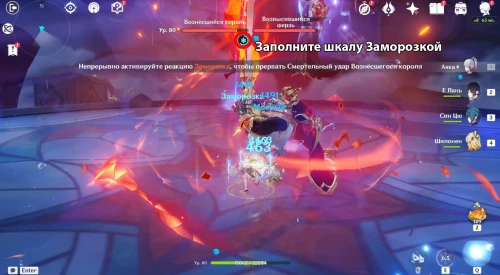 Итак, если вы, к примеру, видите, что Король встал в середине арены, поднял меч вверх и начал заряжать энергию, то тут же подбегите к нему и начните накладывать на него Заморозку (Гидро + Крио), чтобы заполнить круговую шкалу, появившуюся внизу и справа от полоски здоровья босса. Ни в коем случае не бейте врага Пиро стихией, иначе вы сбросите прогресс накопления шкалы на 50%.