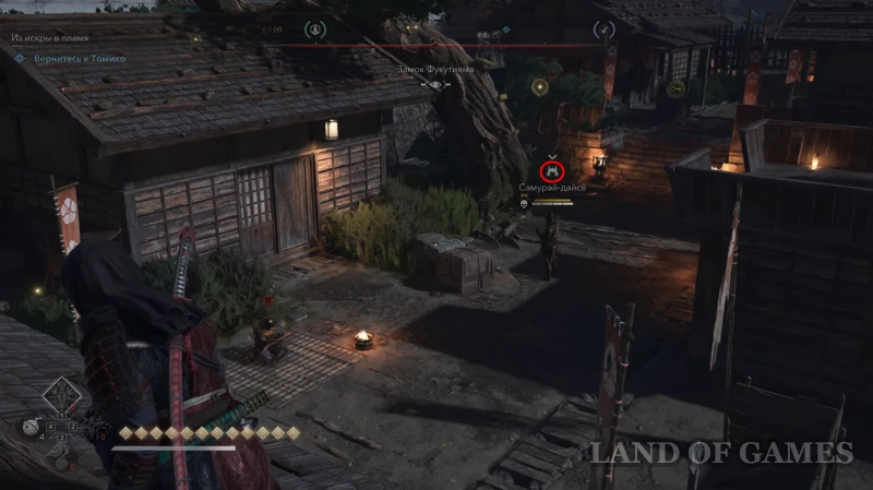 Фукутияму охраняют 5 самураев-дайсе: четверо патрулируют дворы перед замком, и еще один – помещение с легендарным сундуком. На карте выше отмечено местоположение каждого врага (соблюдать выбранный порядок необязательно).