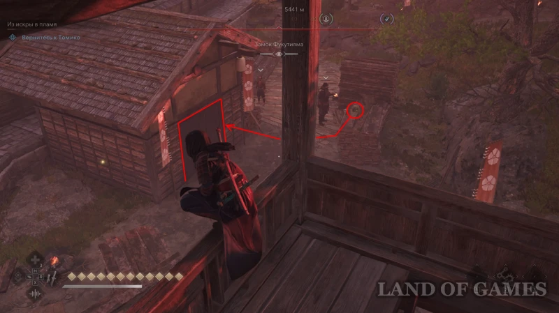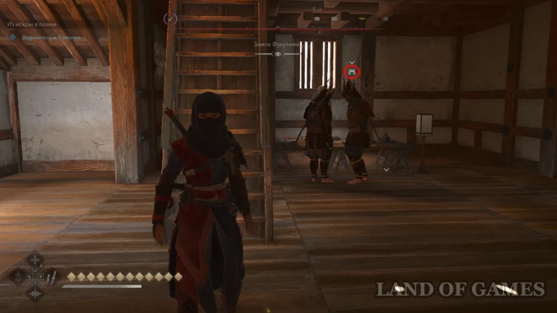 И пятый самурай стоит в комнате на верхнем ярусе главного здания Фукутиямы (под точкой синхронизации). Проще всего подняться на крышу, зайти через балкон и спуститься по лестнице на этаж ниже – тут будет ждать последняя цель и еще один хорошо экипированный солдат.