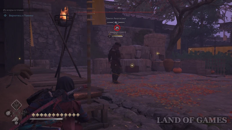Крепость Амагасаки окружена внешним и внутренним рвами, в пределах которых найдется пятеро самураев-дайсе (все на открытом воздухе). На карте выше мы отметили все позиции врагов (можете составить свой оптимальный маршрут передвижения).